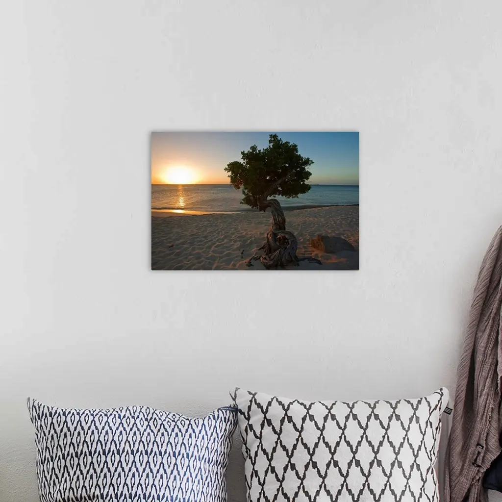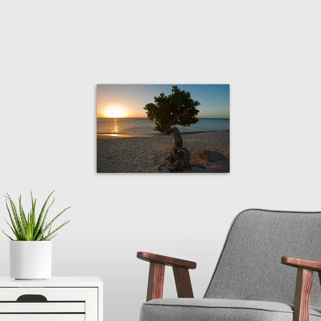A lone, fofoti tree growing on a sandy beach as the sun sets of the ocean in Aruba.