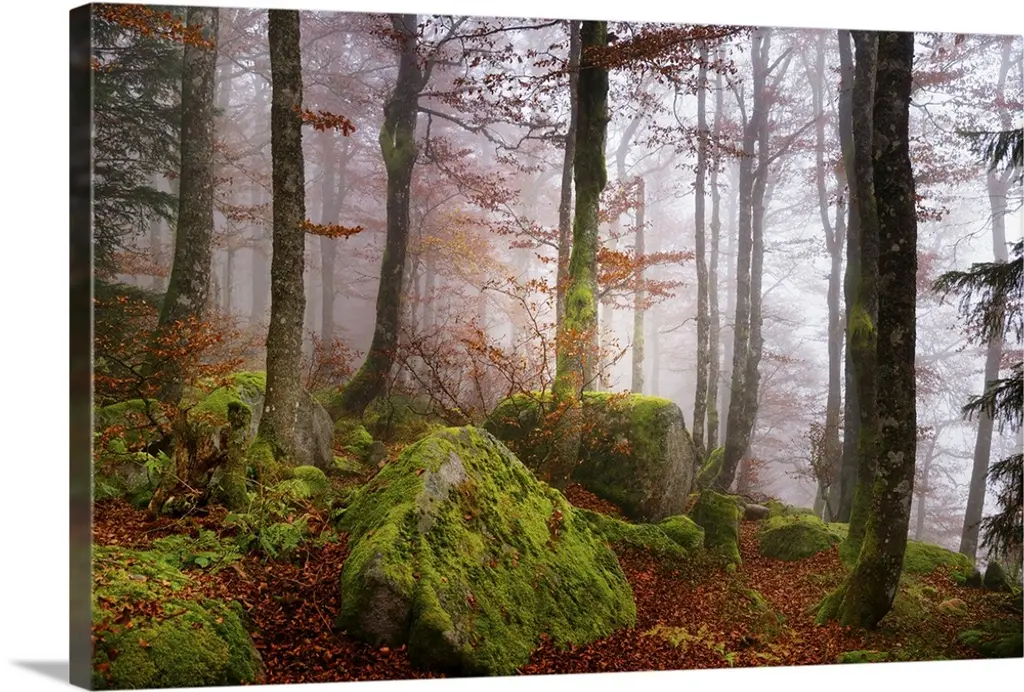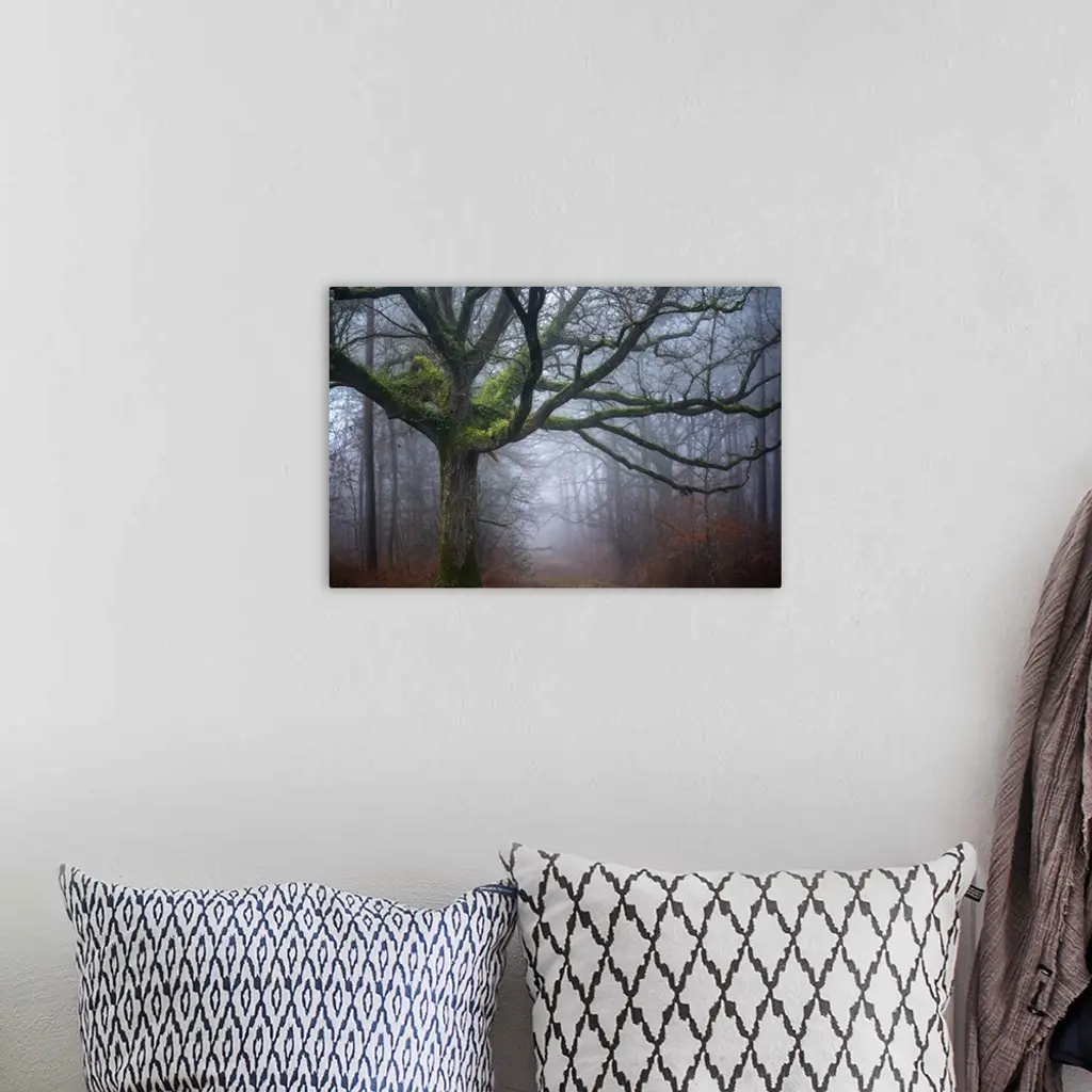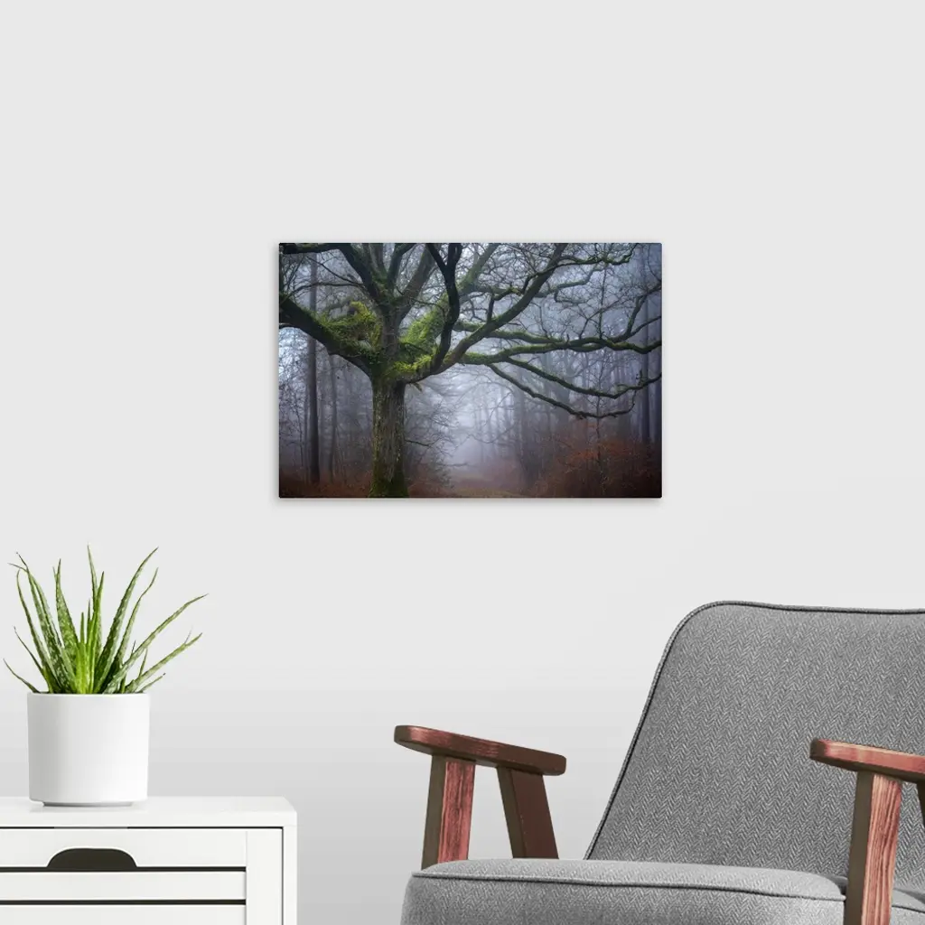 Photograph of an old oak tree covered in green moss in the middle of foggy woods in Autumn.
