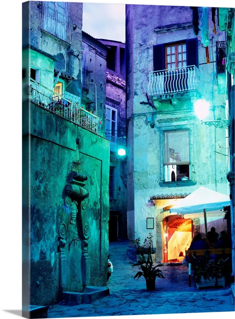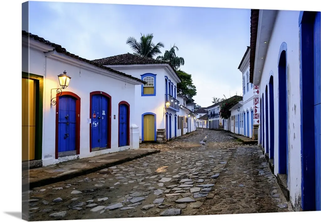 A photograph of an old village, looking down a row of houses.