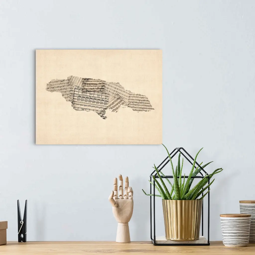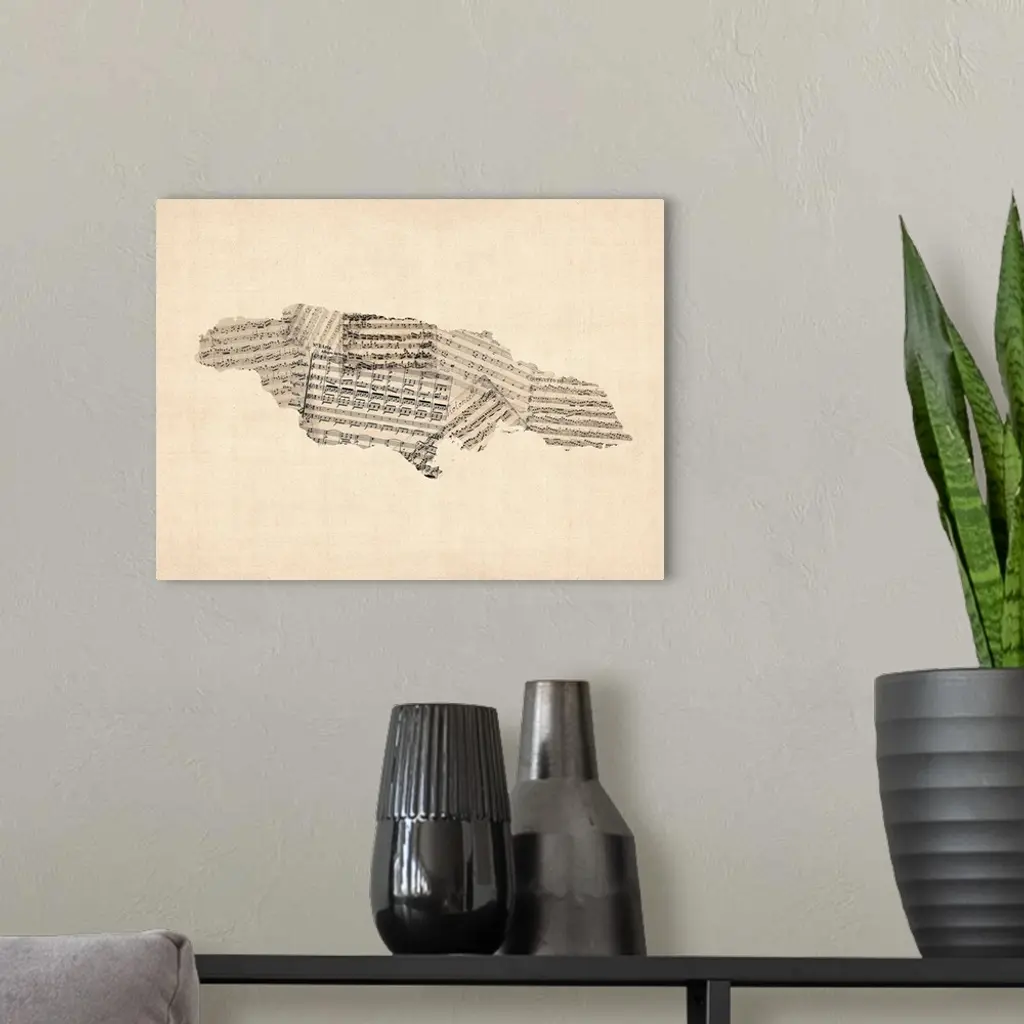 A map of Jamaica made from a collage of old and vintage sheet music on an antique style background.