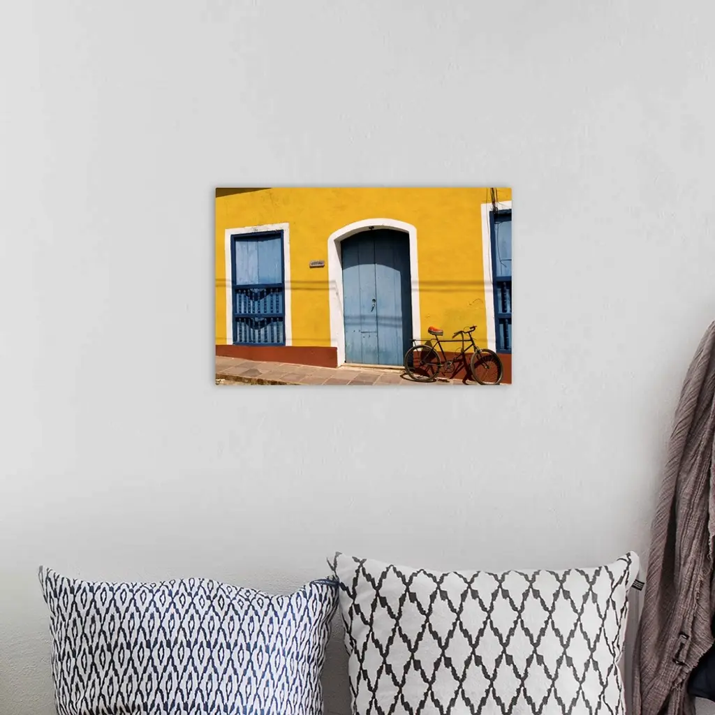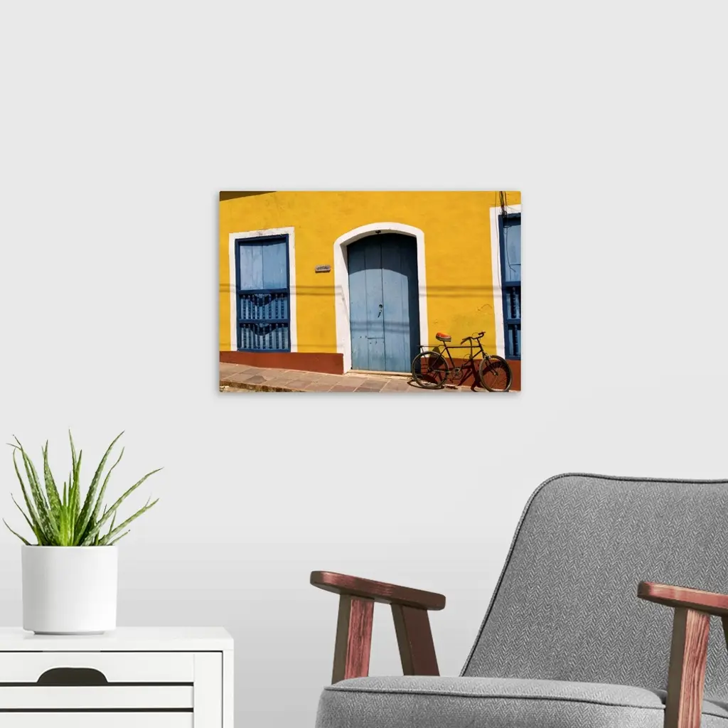 Old yellow building in colonial town of Trinidad Cuba with bike against wall