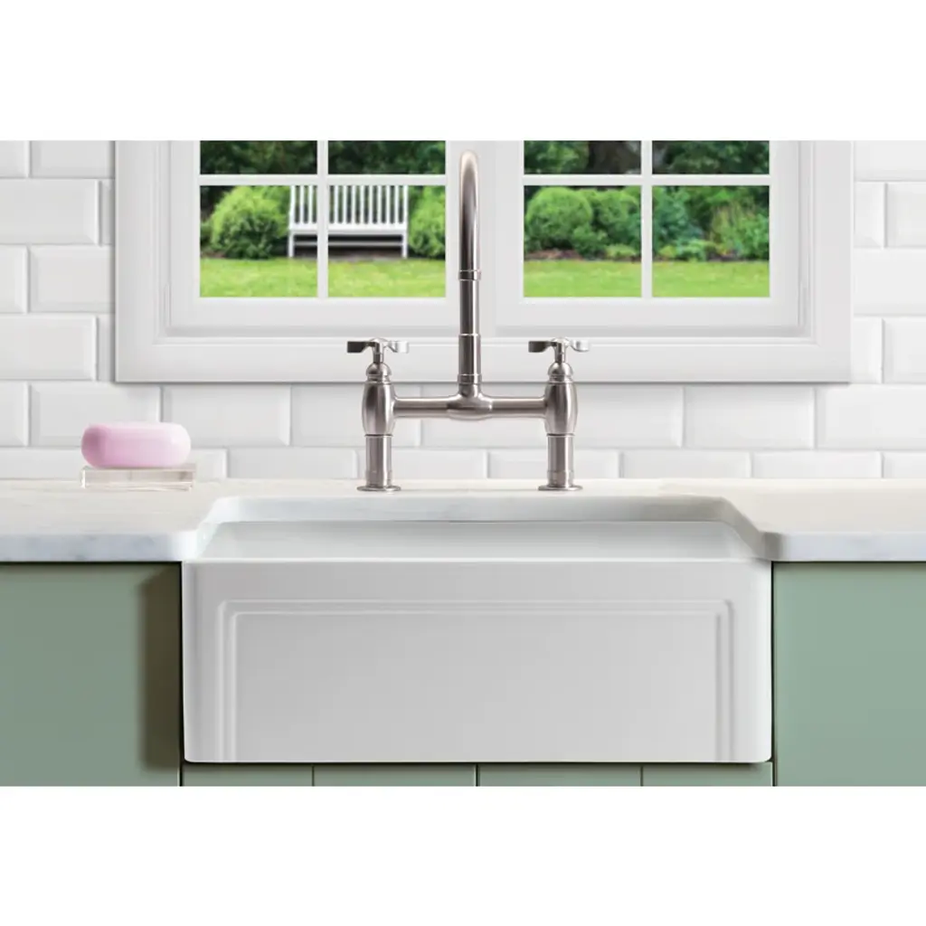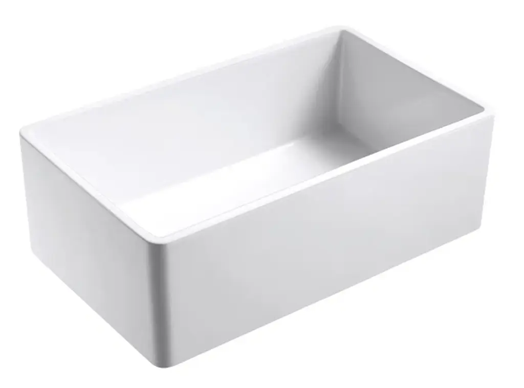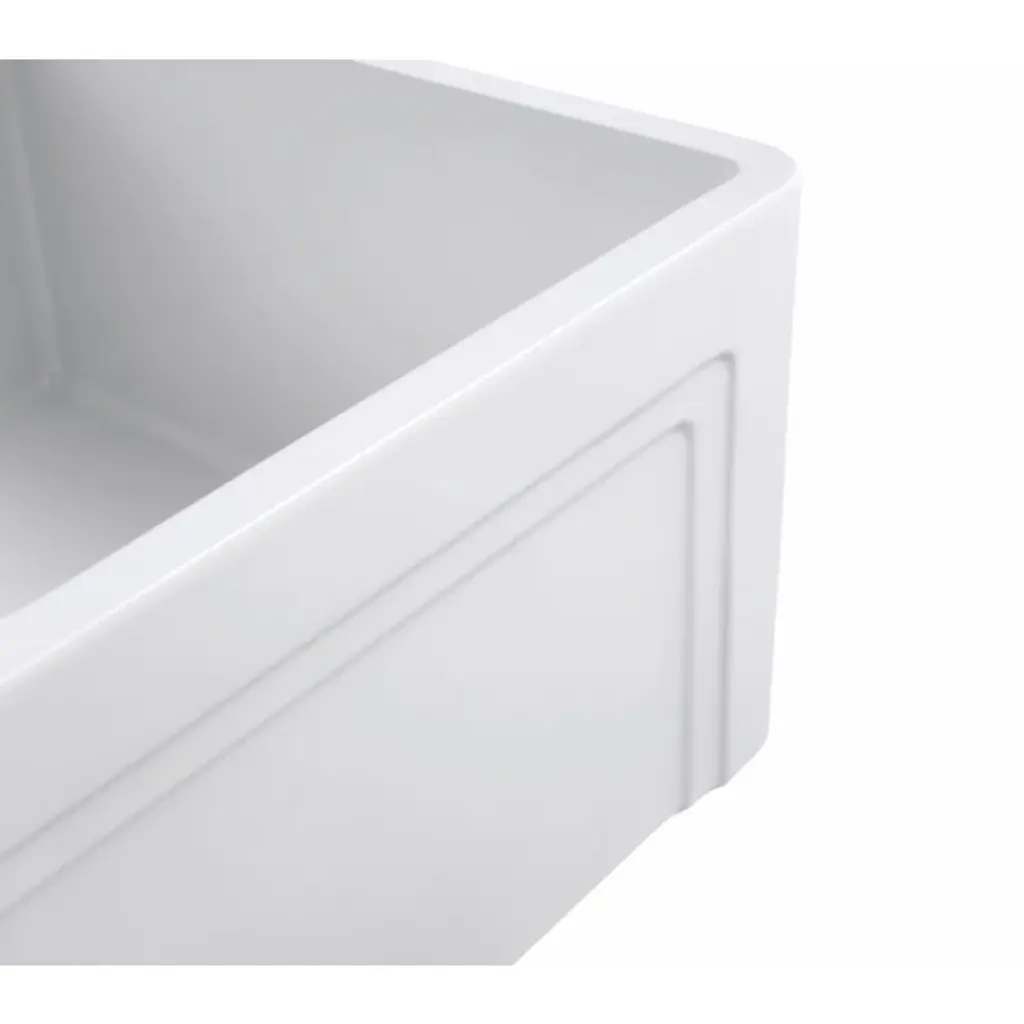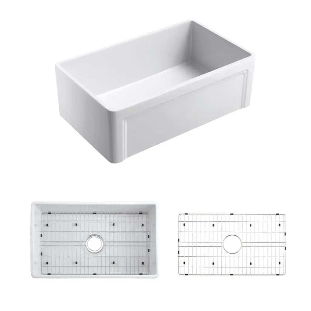 Free grid and strainer. Our fine fireclay kitchen sink is handcrafted in the old English tradition of solid casting, making it stronger than hollow casting. Using the finest raw materials and fired at 2300°F for 20 hours, our fireclay sink is made to last. It is both beautiful and highly durable, resistant to chips, scratches, and stains, with a smooth, easy-to-clean surface. It is glazed on all 4 sides and is reversible, so you can choose between a decorative side or a smooth finish.