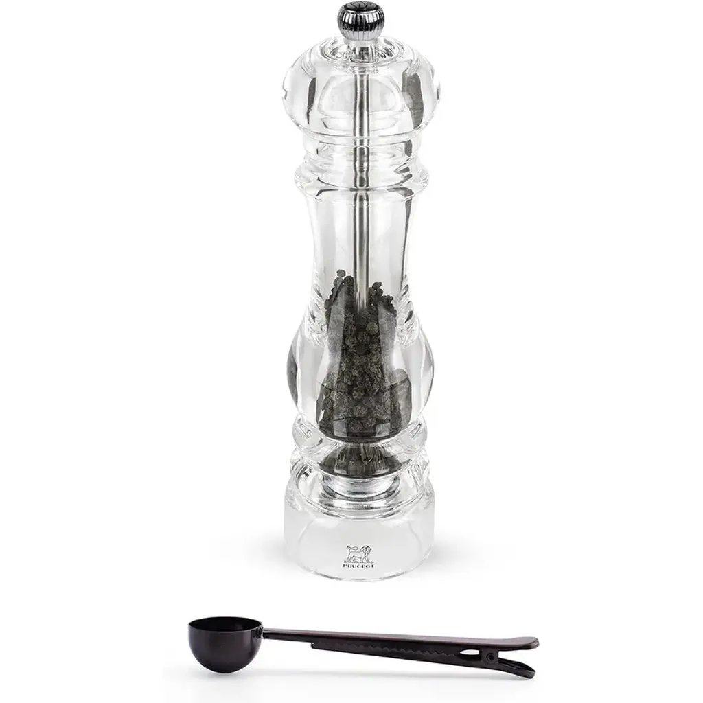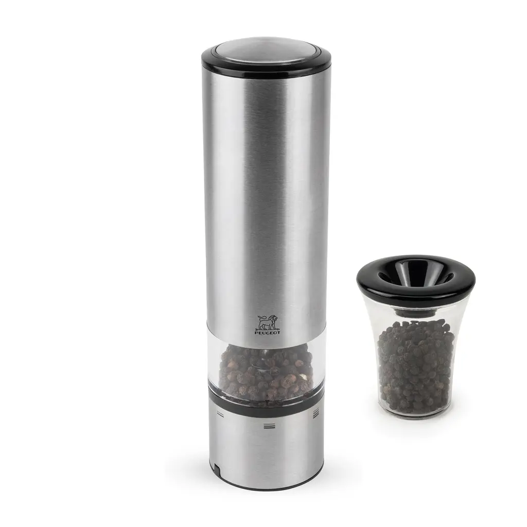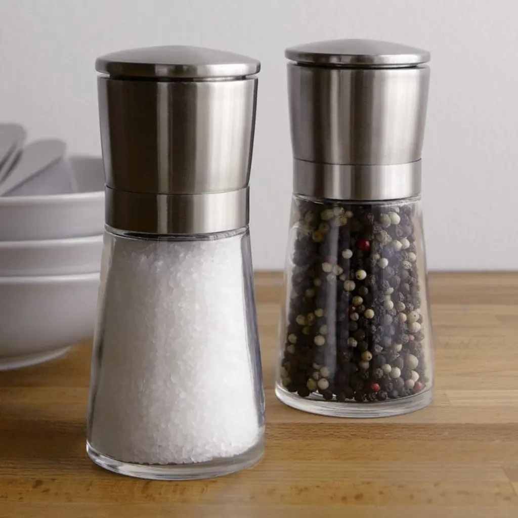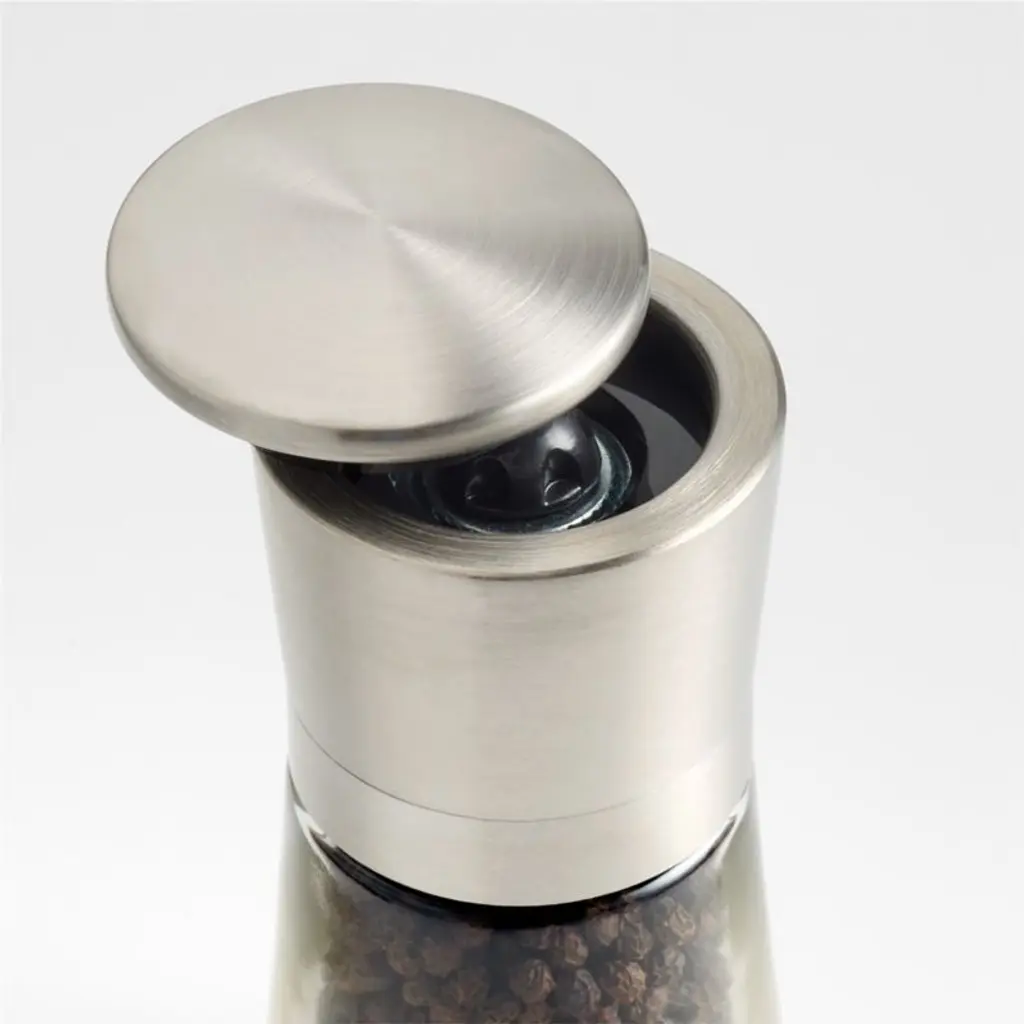 This sleek stainless steel and glass pepper mill offers unique modern styling and seasoning. Remove the stainless cap to reveal an adjustable carbon steel grinding mechanism and dispense pepper. The smart design prevents residual spill. Filled with peppercorns, the mill is ready for use. Pair this pepper grinder with the Bavaria salt mill for a chicly matching set on your dining room table or kitchen countertop.