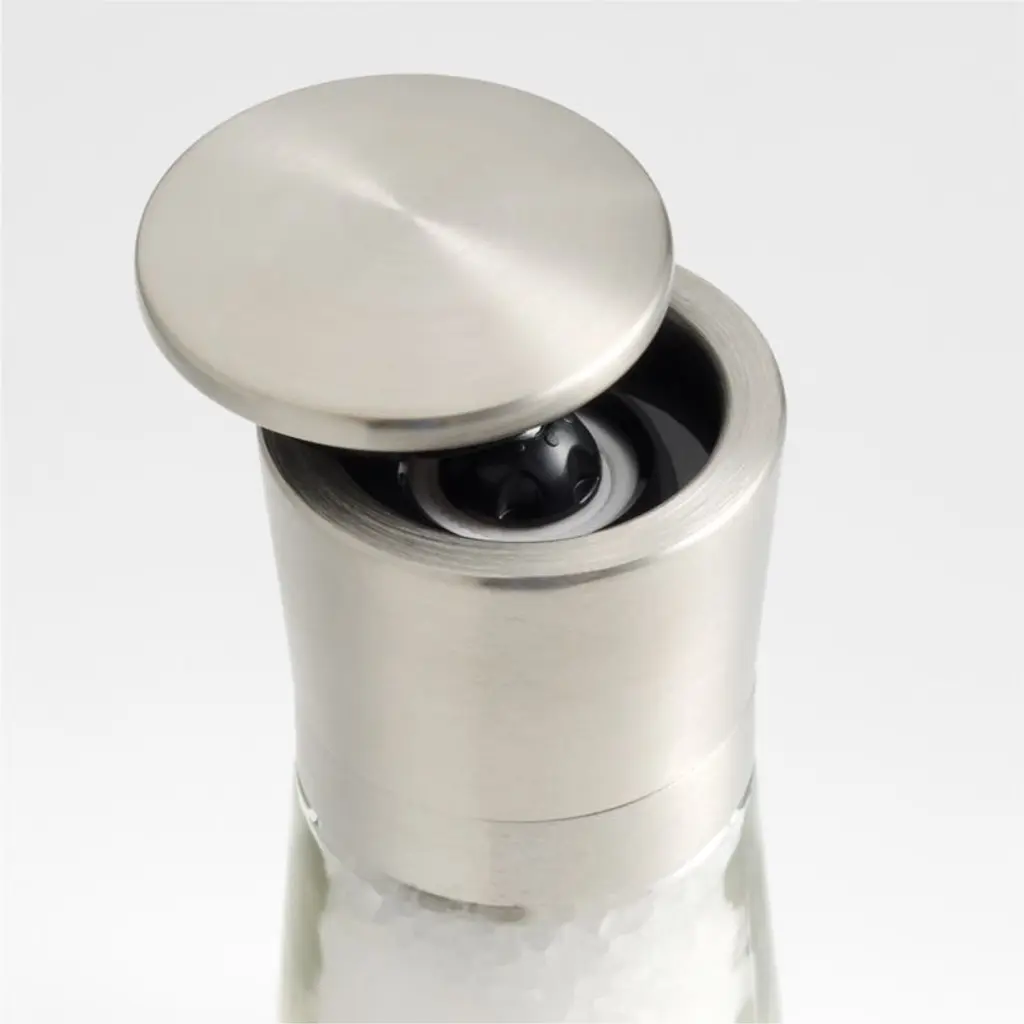 This sleek stainless steel and glass mill offers unique modern styling and seasoning. Remove the stainless cap to reveal an adjustable ceramic grinding mechanism and dispense salt. The smart design prevents residual spill. Filled with sea salt, the mill is ready for use. Pair this salt grinder with the Bavaria pepper mill for a chic matching set on your dining room table or kitchen countertop.