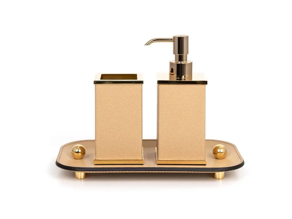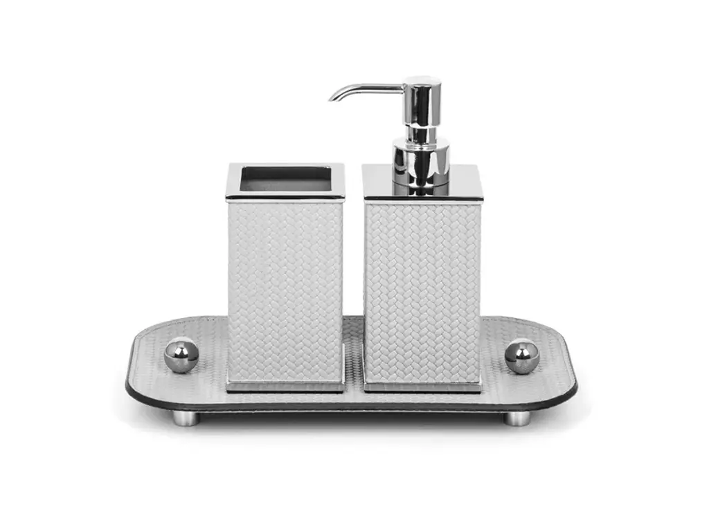 Olimpia is a complete bathroom set with all the bathroom essentials: a round soap dispenser, a toothbrush holder and a cotton pad holder together displayed on our rectangular tray. Clean, crisp lines with perfect accents made in chrome, gold and burnished brass to finish the usual elegance of Pinetti leather upholstery.
