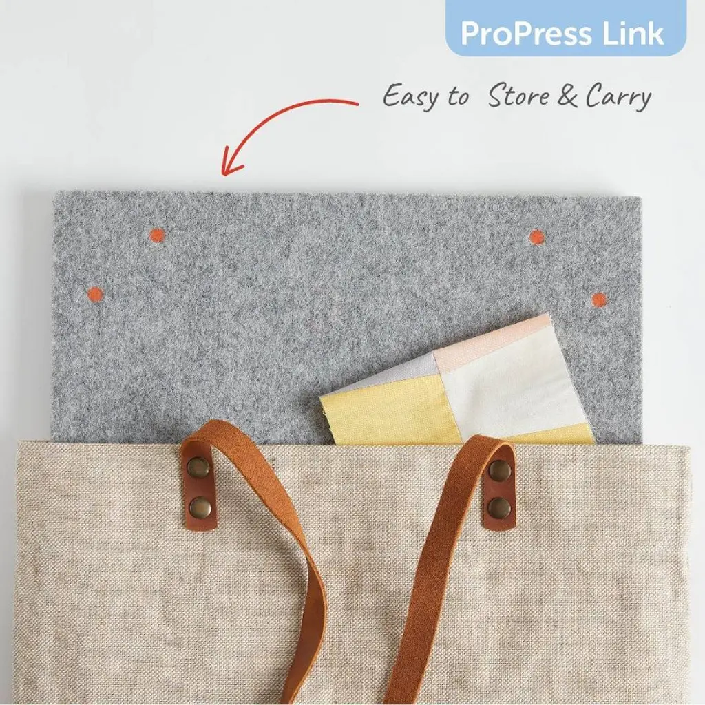 The Pro-Press Mat is a premium-quality pressing mat made from 100% New Zealand wool. It measures at 14”x 14” and ½” thick wool felt, making it ideal for quilting and sewing. The unique ProPress Link™ system lets you customize the size and shape of your pressing area with 4 connectors.