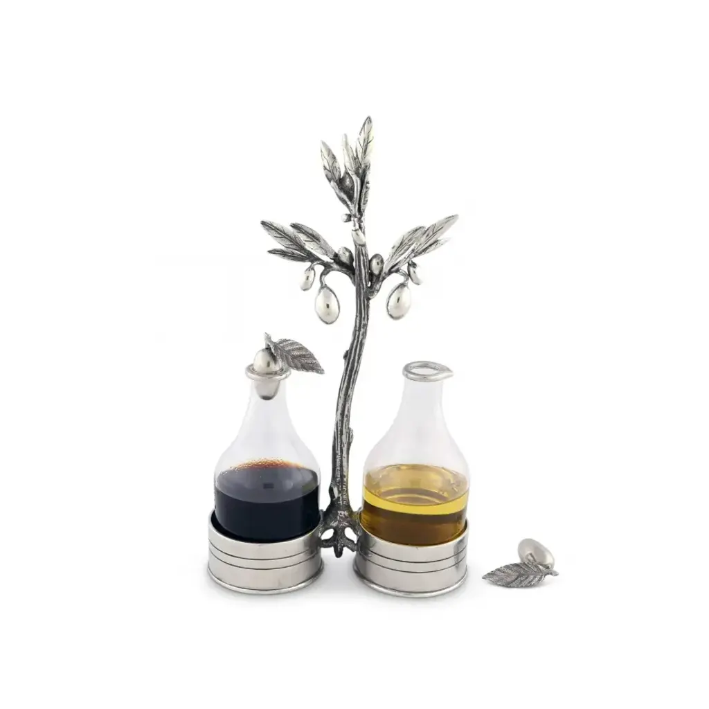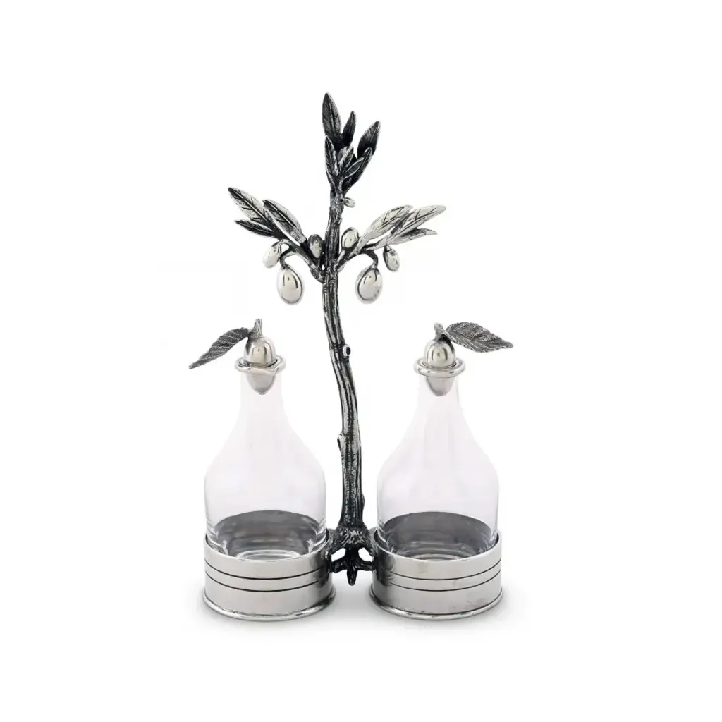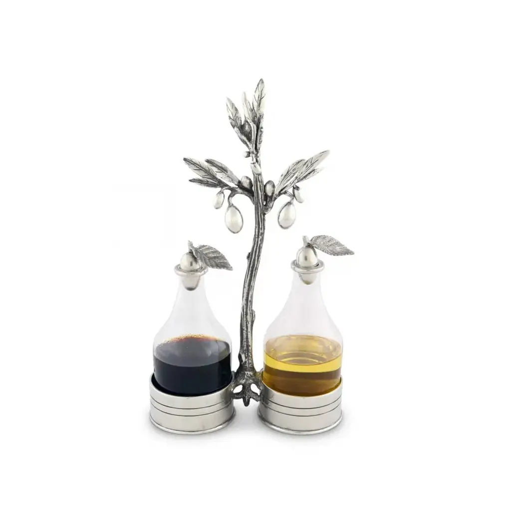 A delicately detailed, pure pewter olive branch, laden with fruit and leaves, is the focal point of Olive Grove Pewter Oil and Vinegar Server. The branch is both the handle and the join for two, banded pewter cups which hold the glass serving bottles. Each bottle has a pewter olive stopper. Vagabond House is a family-owned American company specializing in fine pewter tableware, servingware and giftware. Largely inspired by nature, their exclusive products are designed to be unique, functional heirlooms for those who seek to express tradition and style in both family and formal entertaining.