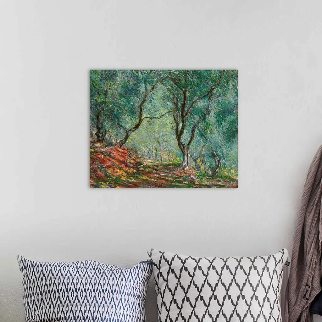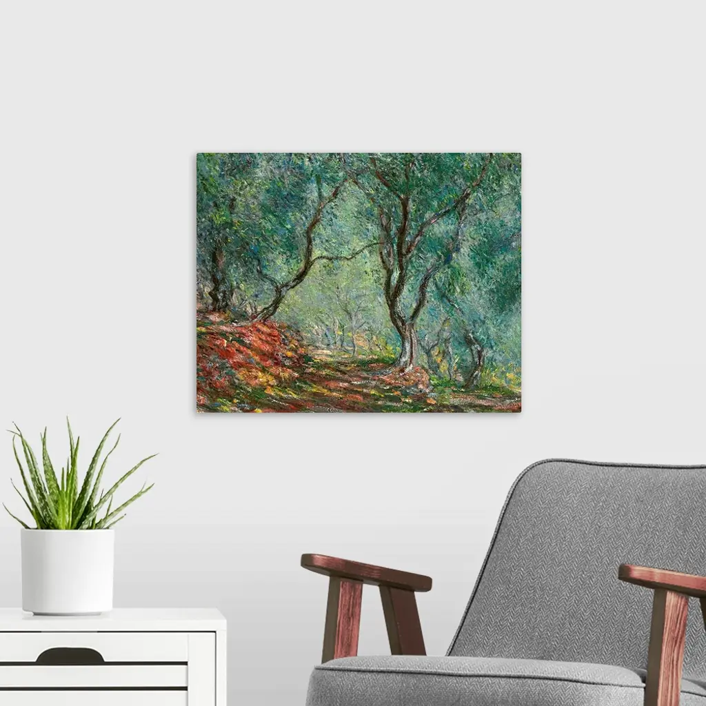 Giant classic art depicts a colorful path traveling down a forest littered with trees as far as the eye can see.