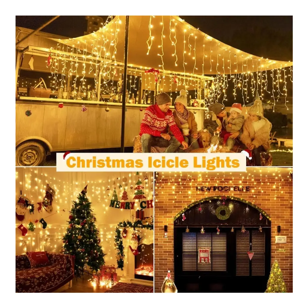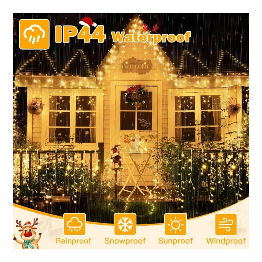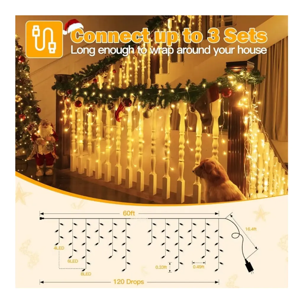 🎄【Connectable & Easy to Hang】720 LED in 60ft string lights, 16.4ft lead wire and total 120 Drops, each string of our LED icicle Christmas lights can be connected up to 3 Sets to illuminate your wider yard. Hang these Warm White dripping icicle lights easily within 5 minutes for the roof or string them for a cheerful Christmas! 🎅【 Energy Saving & Safe to Use】These UL588-listed icicle outdoor lights come with a 29V low voltage plug, offer up to 90% in energy savings than traditional incandescent lights and ensure the max safety. This means children, and pets are safe to touch the hanging Christmas lights. More safety and less power consumption. 🎄【8 Twinkle Modes with Remote & Memory 】Our LED icicle string lights offer 8 different lighting modes for you to choose from (Steady on, In Wave, Sequential, Slo-Glo, Chasing Flash, Fade, Twinkle Flash, and Combination). And thanks to the built-in memory chip, our fairy icicle lights will save your last time lights setting. 🎅【4 Brightness levels & 3 Timer Function】4 Brightness level: 100%-75%-50%-25%; 3 Timer Function: 6H on, 18H off/ 8H on, 16H off/ 6H on, 6H off, 3H on, 9H off. You can adjust Christmas lights for the house by remote easily, and choose one favorite mode to enhance the Christmas spirit. 🎄【IP44 Waterproof 】The Waterproof Christmas string lights are designed to withstand light rain or water spills, making them perfect for both indoor and outdoor Christmas decorations even on rainy or snowy days, like eave, patio, stair, gazebo, fence, trees, roof awnings, or even hung on the wall of your bedroom.