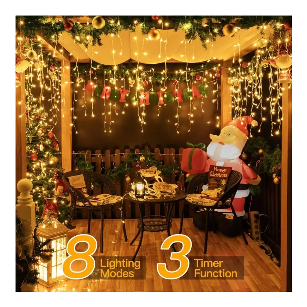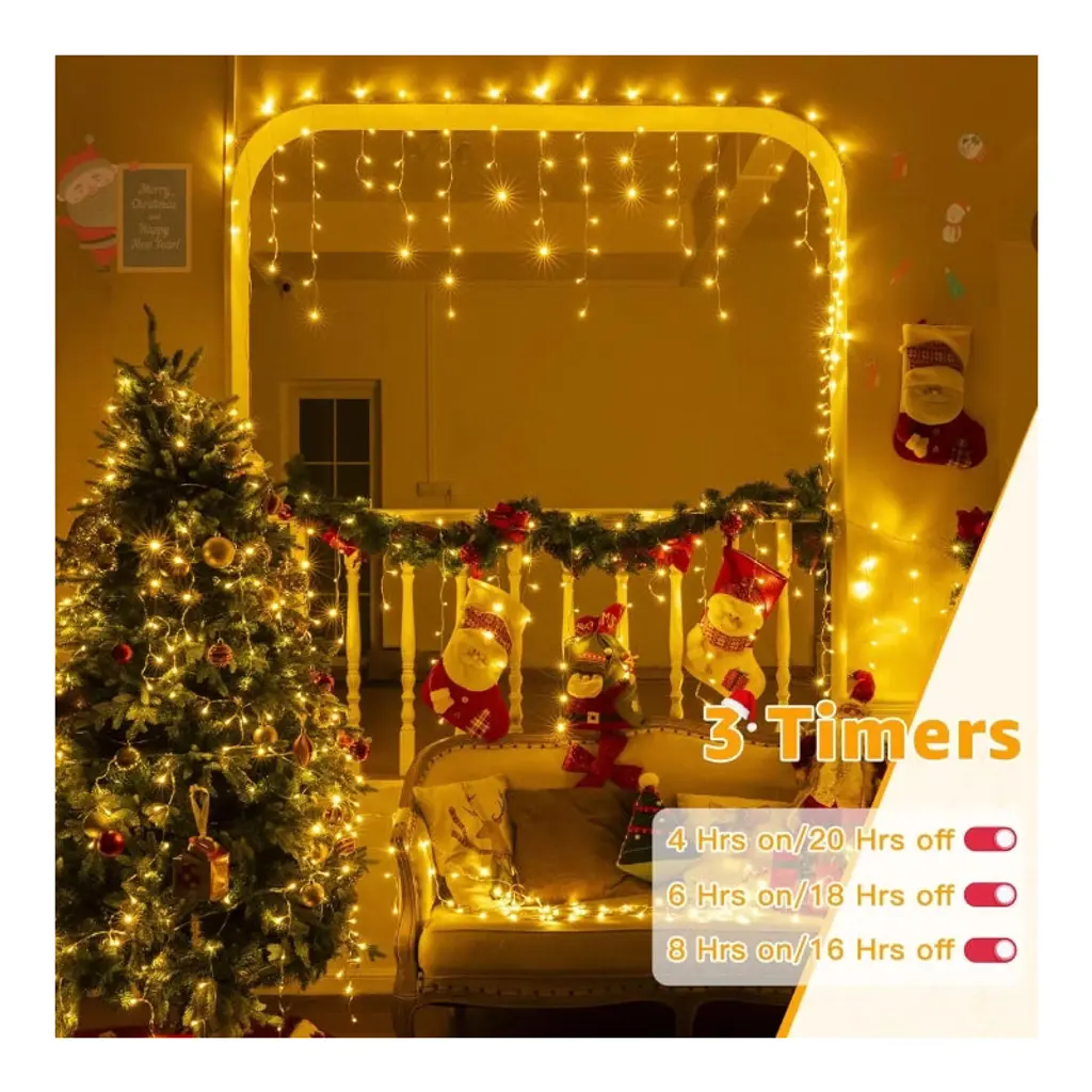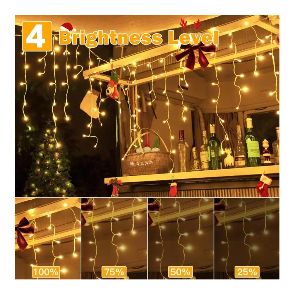 🎄【Connectable & Easy to Hang】720 LED in 60ft string lights, 16.4ft lead wire and total 120 Drops, each string of our LED icicle Christmas lights can be connected up to 3 Sets to illuminate your wider yard. Hang these Warm White dripping icicle lights easily within 5 minutes for the roof or string them for a cheerful Christmas! 🎅【 Energy Saving & Safe to Use】These UL588-listed icicle outdoor lights come with a 29V low voltage plug, offer up to 90% in energy savings than traditional incandescent lights and ensure the max safety. This means children, and pets are safe to touch the hanging Christmas lights. More safety and less power consumption. 🎄【8 Twinkle Modes with Remote & Memory 】Our LED icicle string lights offer 8 different lighting modes for you to choose from (Steady on, In Wave, Sequential, Slo-Glo, Chasing Flash, Fade, Twinkle Flash, and Combination). And thanks to the built-in memory chip, our fairy icicle lights will save your last time lights setting. 🎅【4 Brightness levels & 3 Timer Function】4 Brightness level: 100%-75%-50%-25%; 3 Timer Function: 6H on, 18H off/ 8H on, 16H off/ 6H on, 6H off, 3H on, 9H off. You can adjust Christmas lights for the house by remote easily, and choose one favorite mode to enhance the Christmas spirit. 🎄【IP44 Waterproof 】The Waterproof Christmas string lights are designed to withstand light rain or water spills, making them perfect for both indoor and outdoor Christmas decorations even on rainy or snowy days, like eave, patio, stair, gazebo, fence, trees, roof awnings, or even hung on the wall of your bedroom.