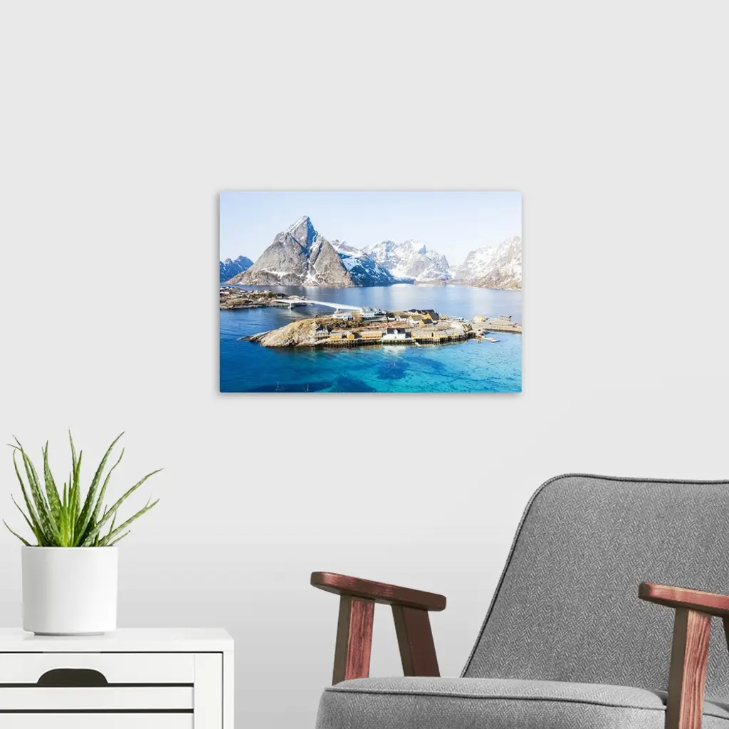 Aerial view of Olstind mountain peak and turquoise sea surrounding Sakrisoy village and Reine Bay, Lofoten Islands, Norway, Scandinavia, Europe