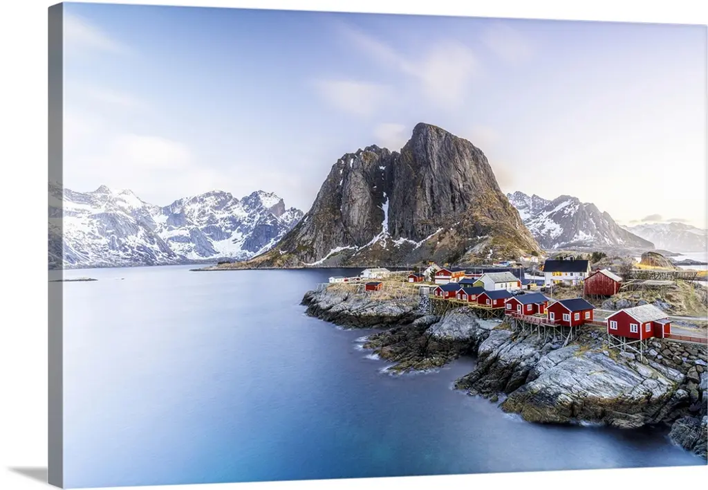 Olstind Mountain Peak And Sea Surrounding Sakrisoy Village And Reine Bay, Norway