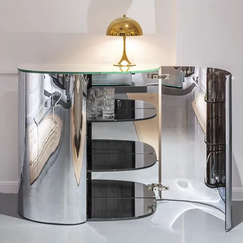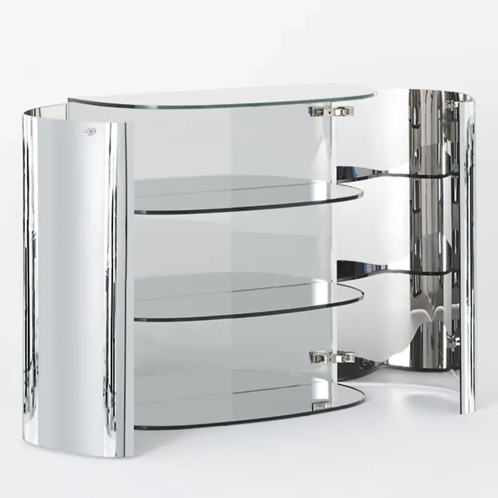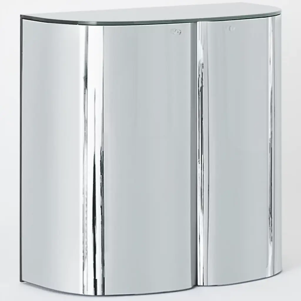 The Oltralpe from Glas Italia offers storage with style. An award-winning Inga Sempé design made in Italy, this glamourous construction of mirrored glass ascends from a curved base. Two shelves are shielded from view by a curving door that envelops the shelves. A clear knob actuates the door, blending into the mirrored surface, while the soft-motion closure of the door ensures each item will stay stately and secure.