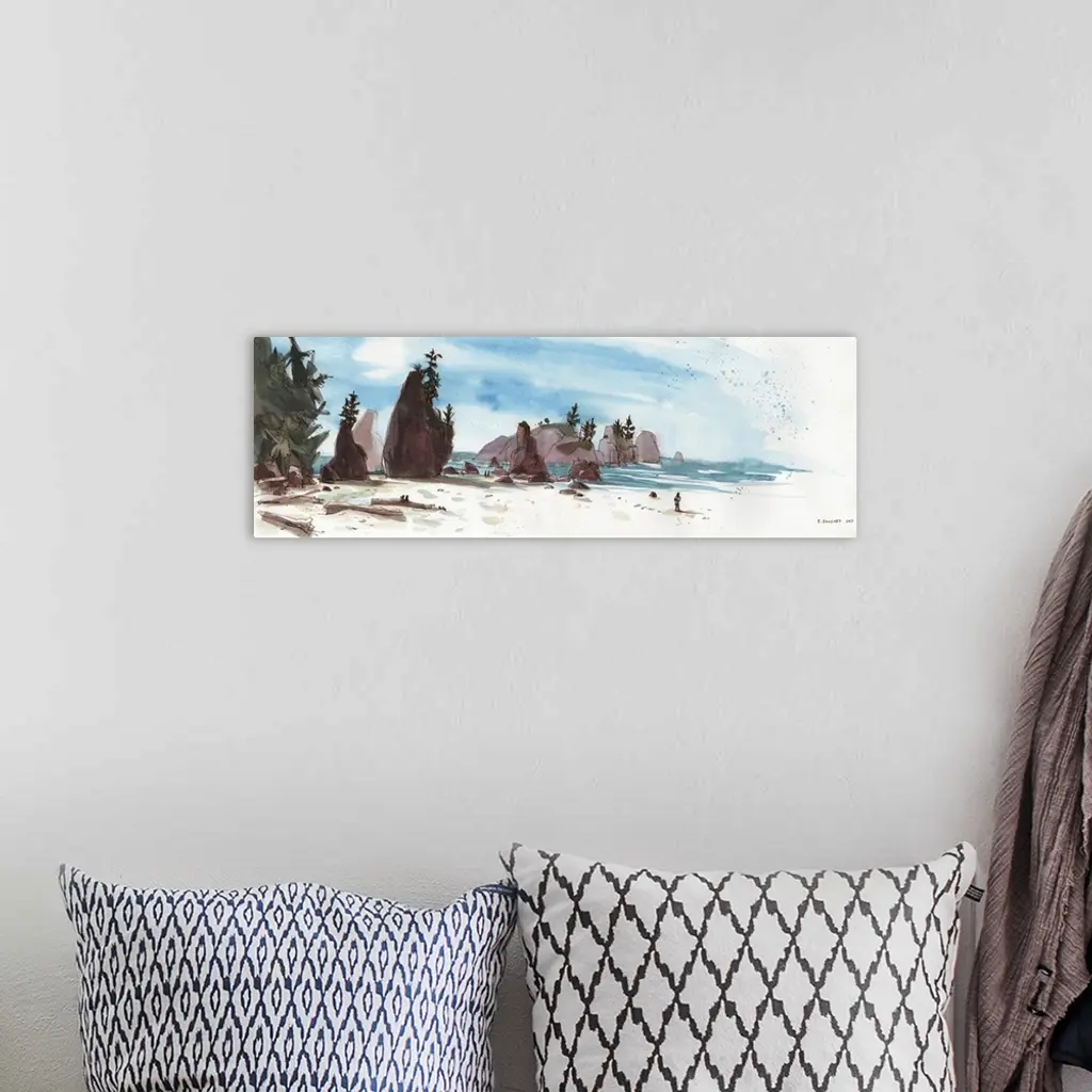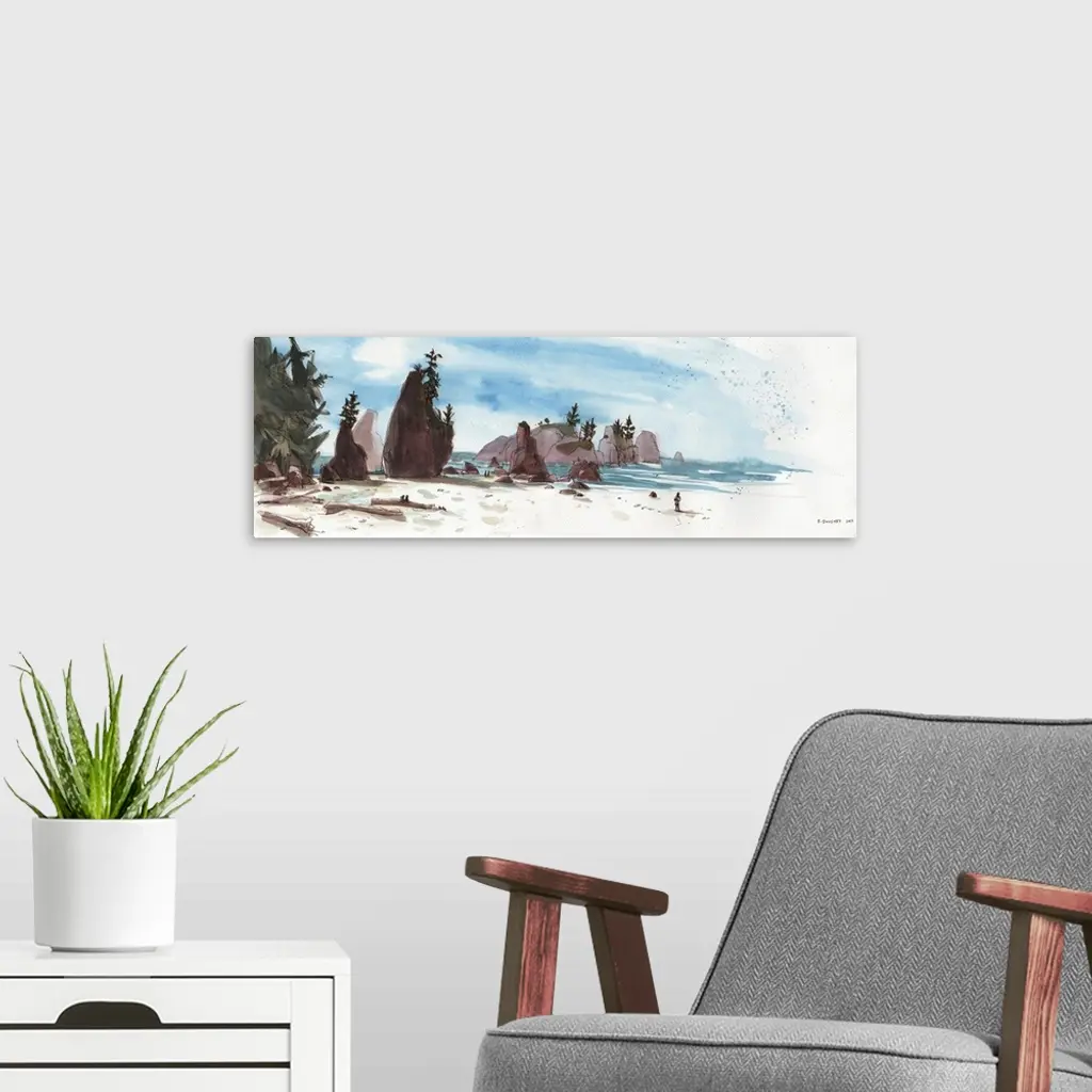 Sparse beachcombers enjoy a sunny day on the rocky Olympic Coast of northwestern Washington State.