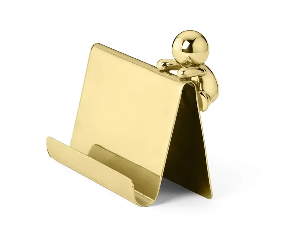 A must-have accent for any office desk, this exquisite card holder is essential for professionals in any field. The sleek, upside-down V design and wide insert allow for elegant display of business cards. A small, stylized man effortlessly hangs over the top holder, seemingly peering down at the cards. This unique business card holder can serve as a useful desk accessory as well as an original card holder on a modern, informal table.