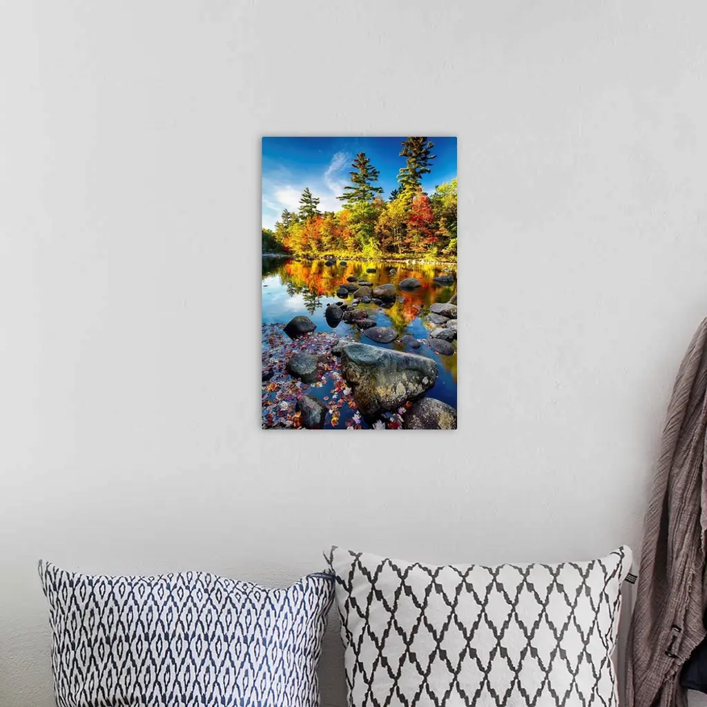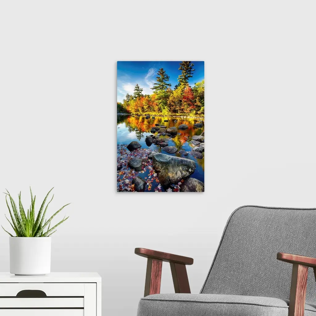 Fine art photo of bright colors of a forest in autumn being reflected in a pond full of rocks.