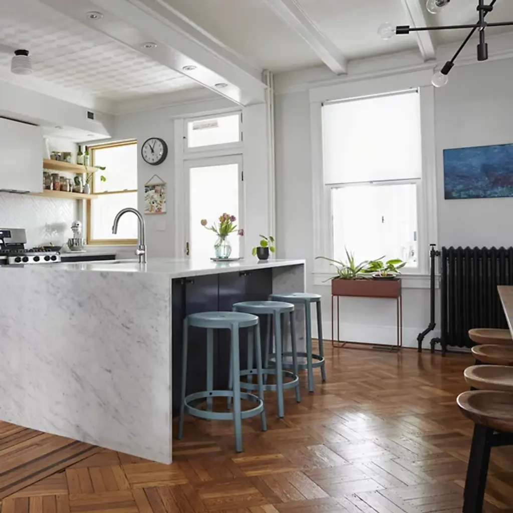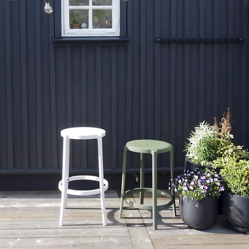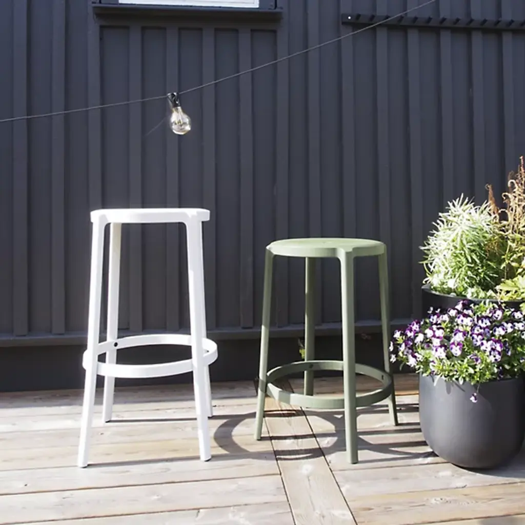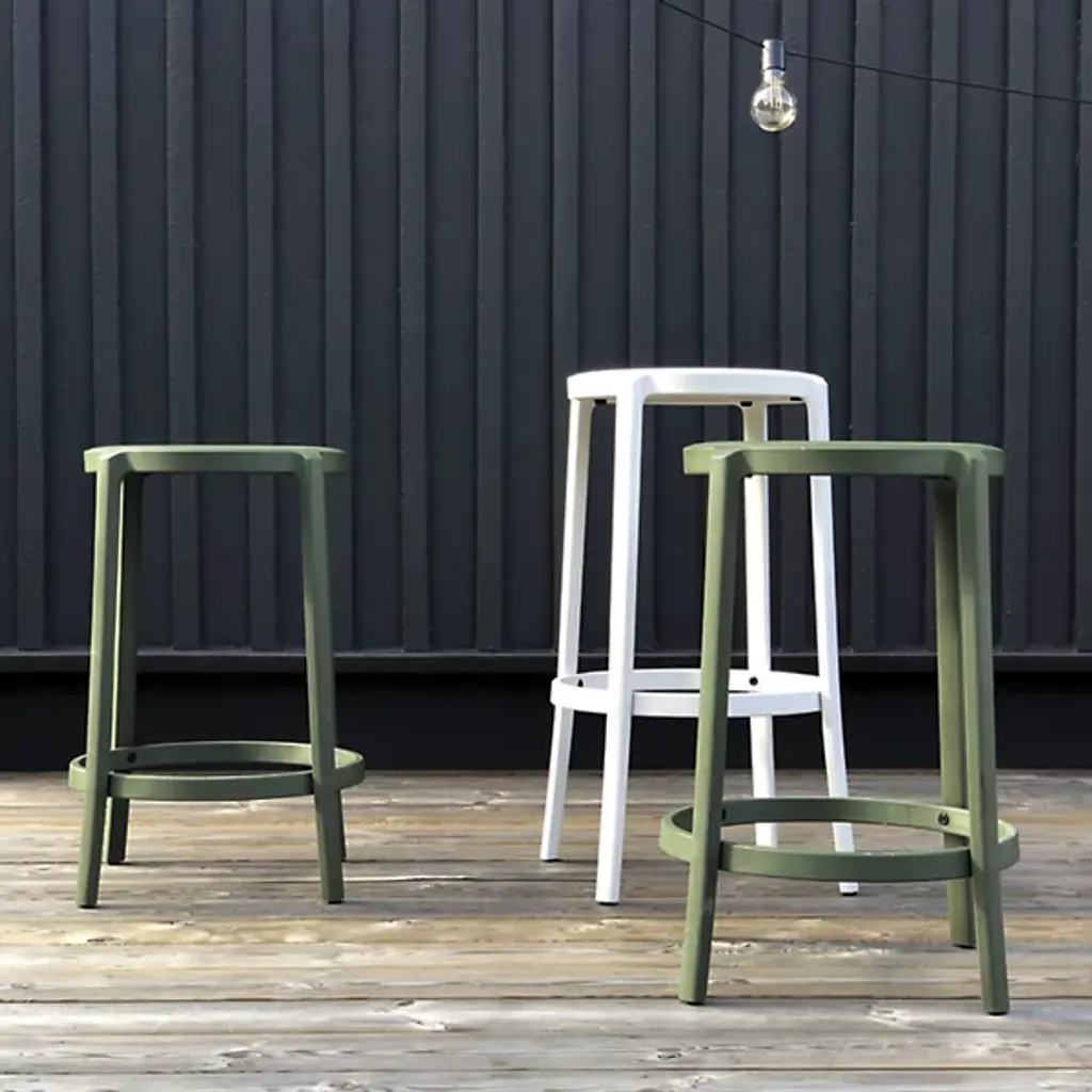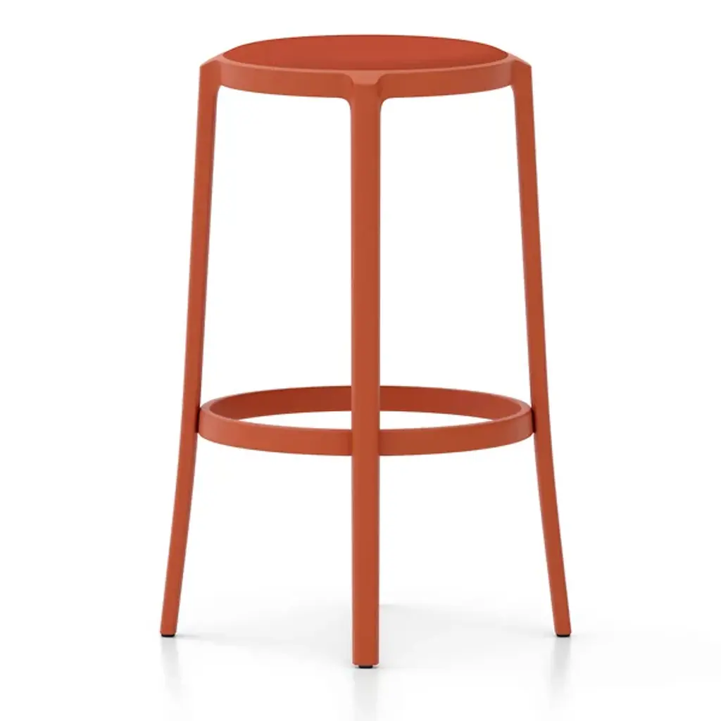 A solid, eco-friendly take on the 1930s bentwood café chair. The On & On Barstool from Emeco isn’t just designed to go on and on as a built-to-last construction but also as a stylishly enduring silhouette. The piece represents designers E. Barber and J. Osgerby’s push for creating pieces that harness today’s cutting-edge materials. Newly developed at the Emeco labs, recycled PET plastic is called on in this piece for its sustainability, lightweight properties, and immense strength. This plastic is shaped beautifully into a trim frame you can easily lift with your hand. Supported by a molded crossbar, a low-profile circular seat rest brings you the classic comfort and aesthetic of the 30s café chair. When not in use, this piece is as charming to look at as it stacks elegantly in a circular formation.