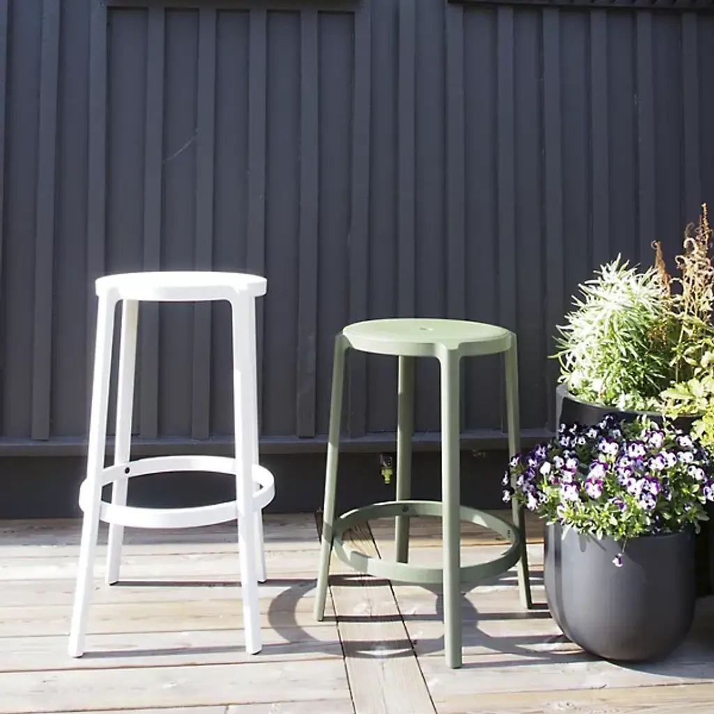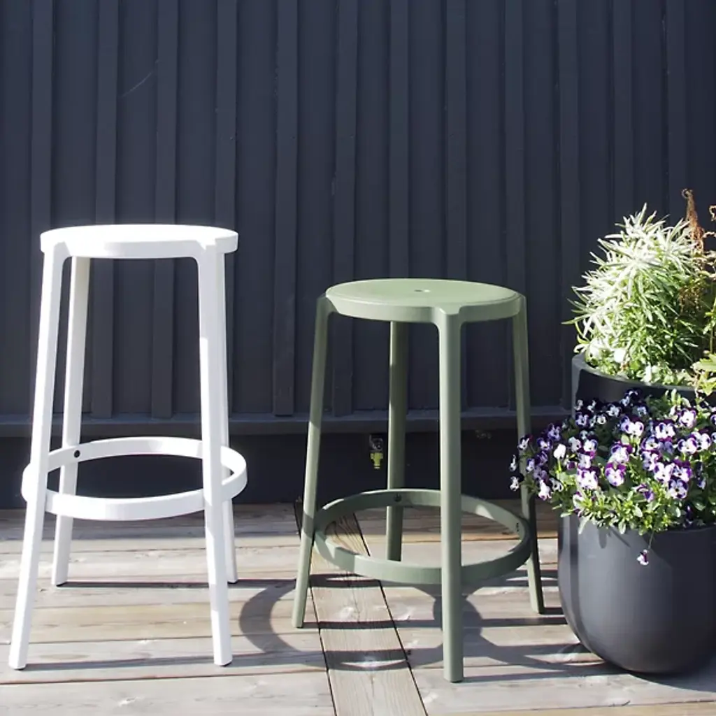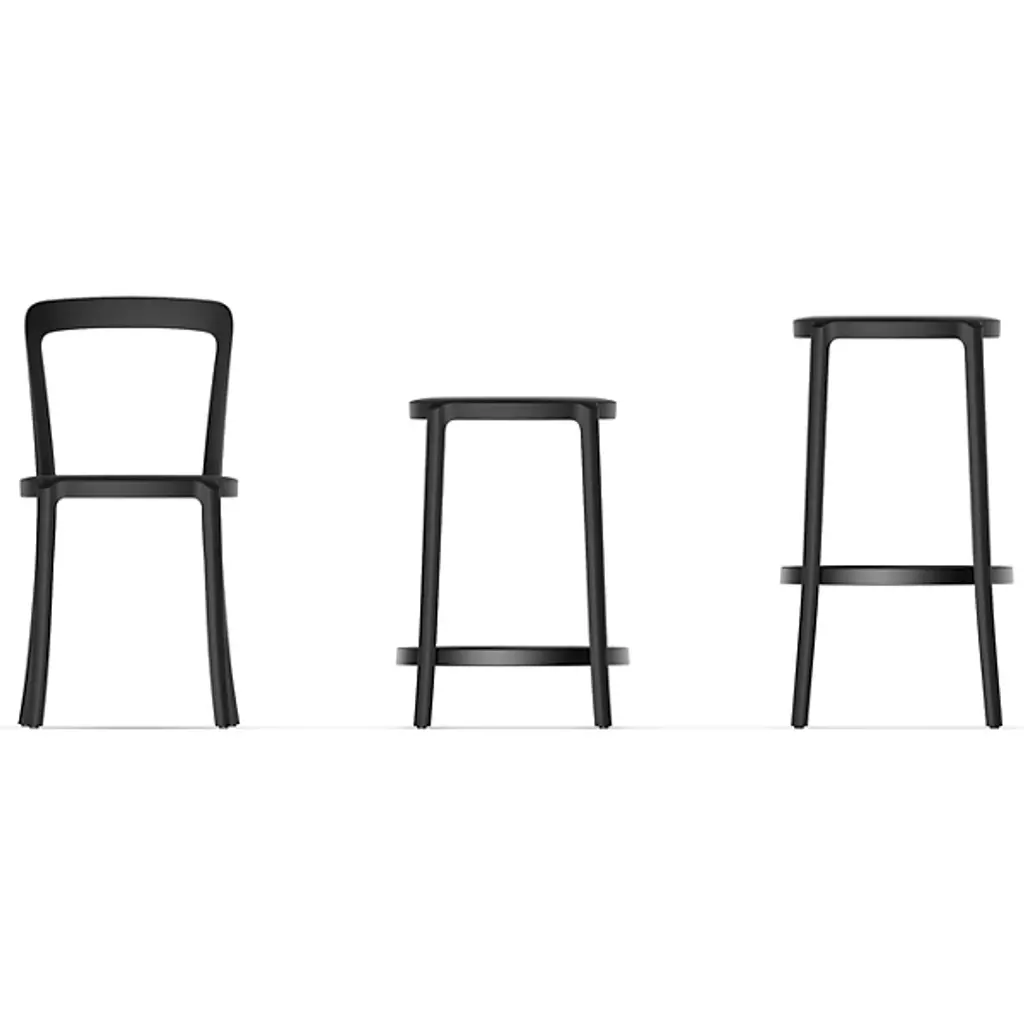 A solid, eco-friendly take on the 1930s bentwood café chair. The On & On Barstool from Emeco isn’t just designed to go on and on as a built-to-last construction but also as a stylishly enduring silhouette. The piece represents designers E. Barber and J. Osgerby’s push for creating pieces that harness today’s cutting-edge materials. Newly developed at the Emeco labs, recycled PET plastic is called on in this piece for its sustainability, lightweight properties, and immense strength. This plastic is shaped beautifully into a trim frame you can easily lift with your hand. Supported by a molded crossbar, a low-profile circular seat rest brings you the classic comfort and aesthetic of the 30s café chair. When not in use, this piece is as charming to look at as it stacks elegantly in a circular formation.