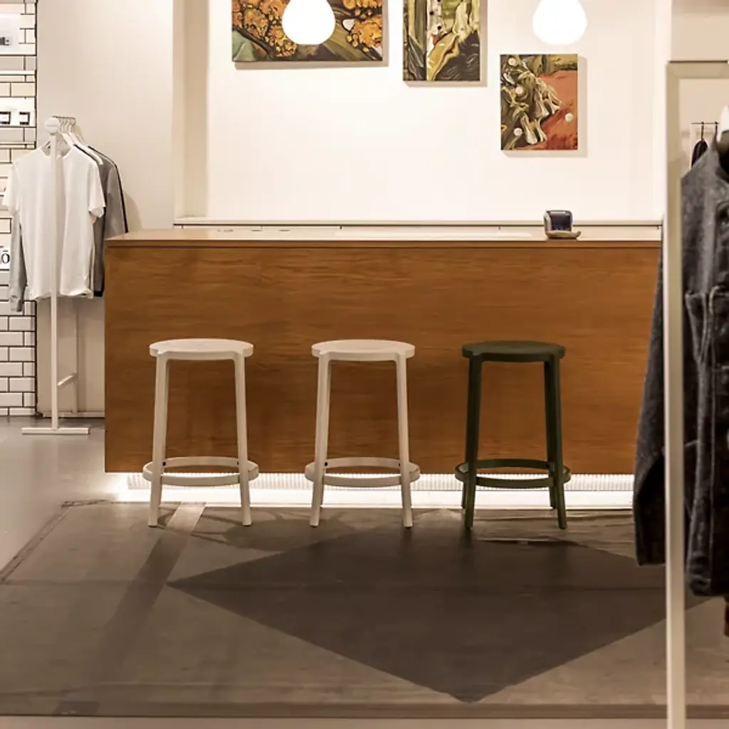 A solid, eco-friendly take on the 1930s bentwood café chair. The On & On Barstool from Emeco isn’t just designed to go on and on as a built-to-last construction but also as a stylishly enduring silhouette. The piece represents designers E. Barber and J. Osgerby’s push for creating pieces that harness today’s cutting-edge materials. Newly developed at the Emeco labs, recycled PET plastic is called on in this piece for its sustainability, lightweight properties, and immense strength. This plastic is shaped beautifully into a trim frame you can easily lift with your hand. Supported by a molded crossbar, a low-profile circular seat rest brings you the classic comfort and aesthetic of the 30s café chair. When not in use, this piece is as charming to look at as it stacks elegantly in a circular formation.