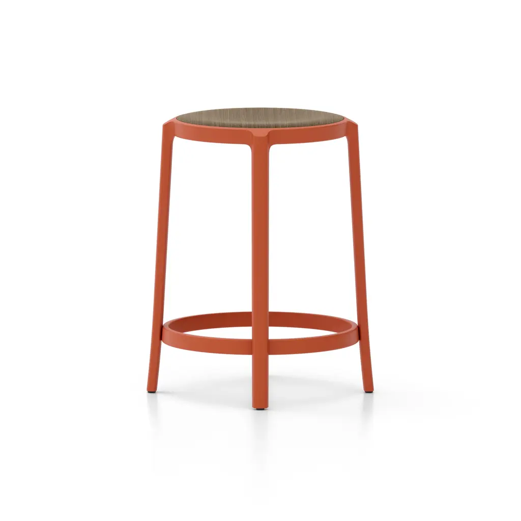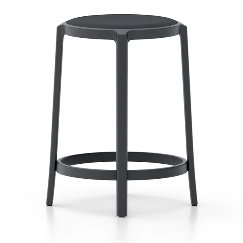 A durable, elegant, and modern take design on the classic bentwood café chairs of the 30s. Physically and visually, the On & On Barstool with Upholstered Seat from Emeco is here to last as its poetic name suggests. It’s a design by E. Barber and J. Osgerby, a design duo constantly innovating and experimenting, especially in the realm of materials and color. Sharing an eco-conscious stance with Emeco, the duo put to use the American brand’s newly engineered recycled PET plastic. This plastic is shaped into a frame with no wasted movement, making it an element that delivers on looks and lightweight durability. Over a molded crossbar, an upholstered circular seat rest highlights the barstool’s café roots. This seat brings you real comfort all in a low-profile. When the time requires, you can easily stack these stools circularly.
