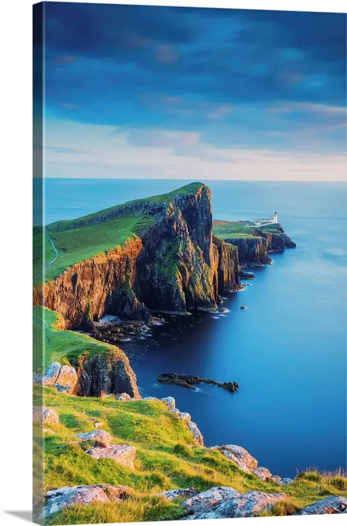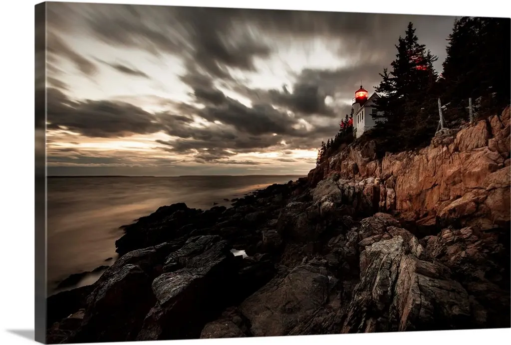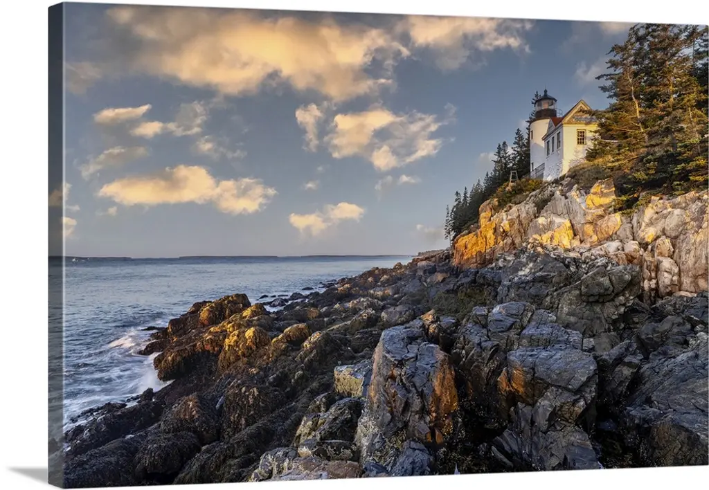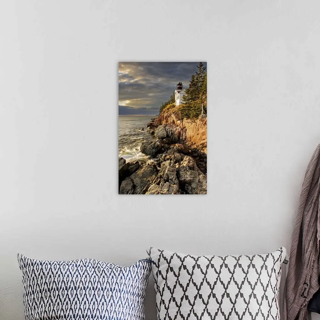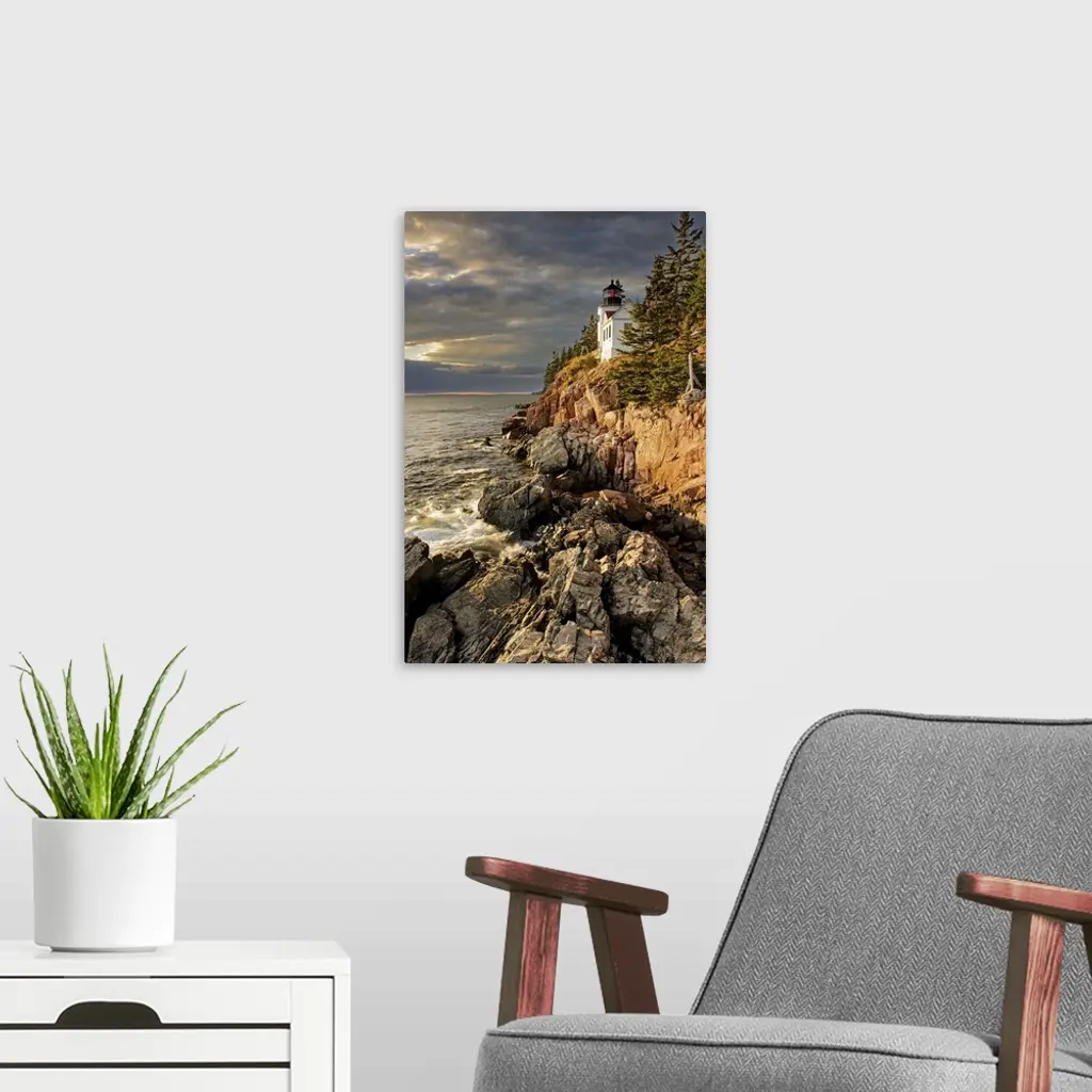 A photograph of a lighthouse on a rocky escarpment on the coastline.