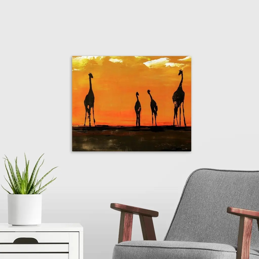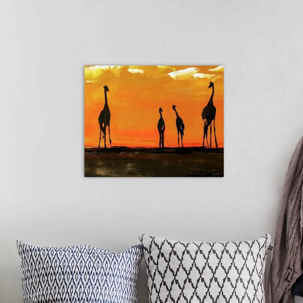 Portrait of giraffes on the African plain in front of a vibrant, orange background.