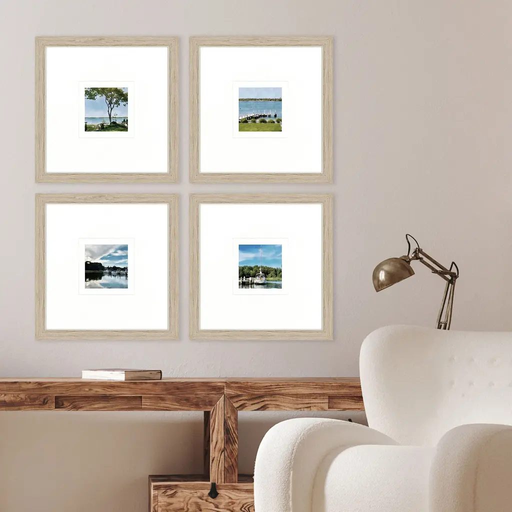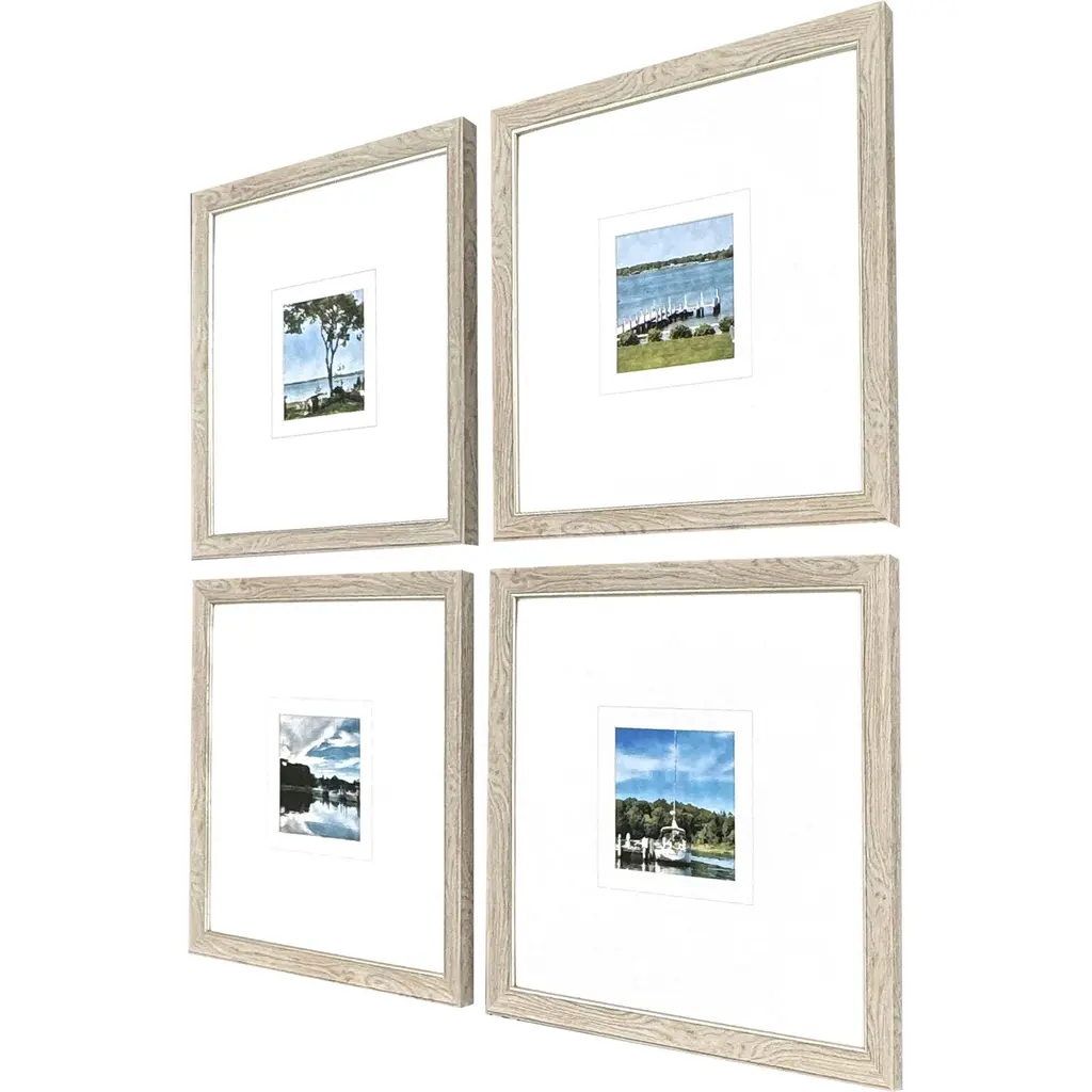 A set of four prints feature various shoreline views. Matted in white and framed in a natural wood finish molding with a champagne gold lip.