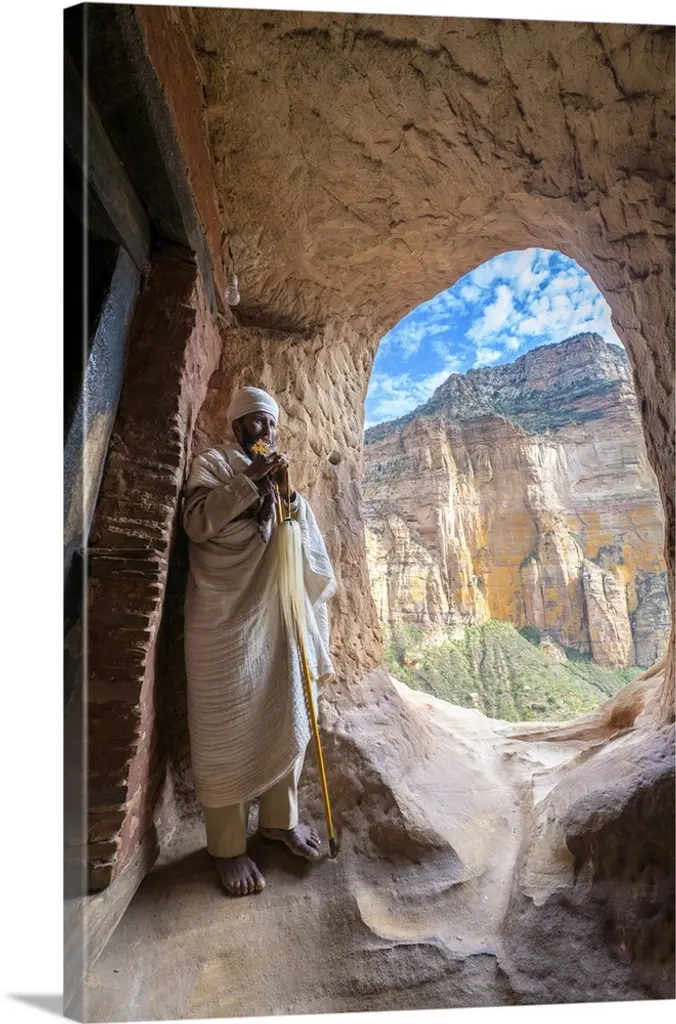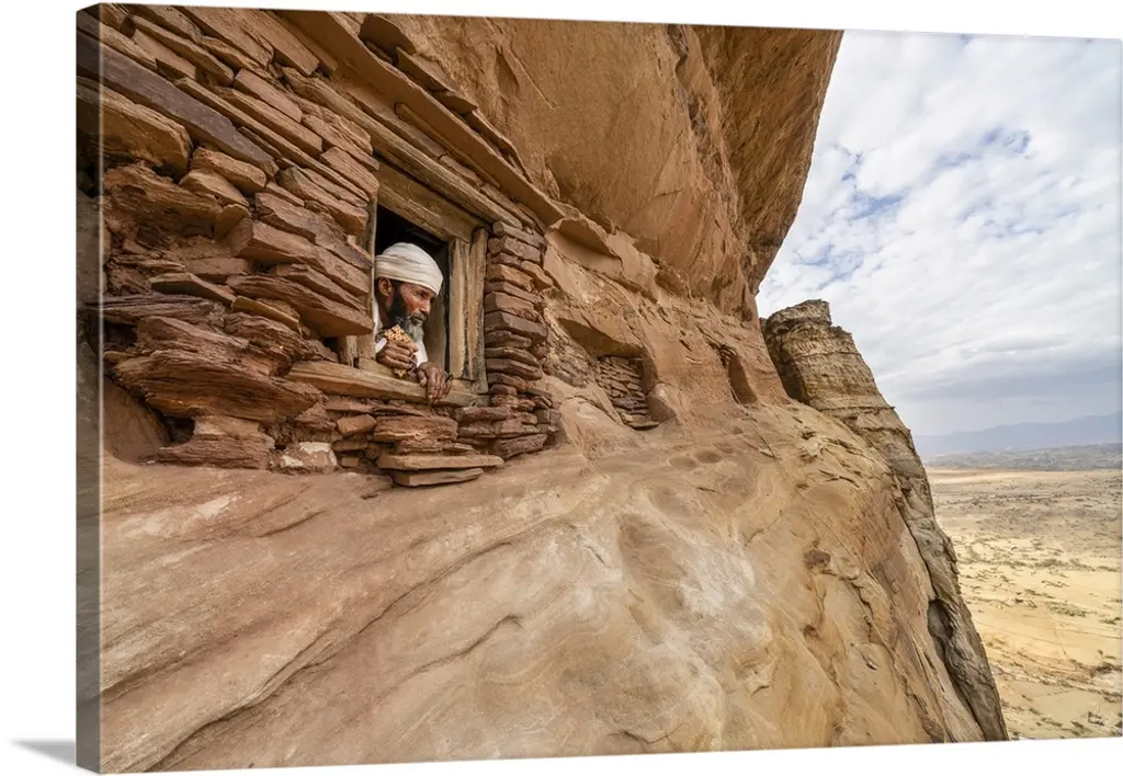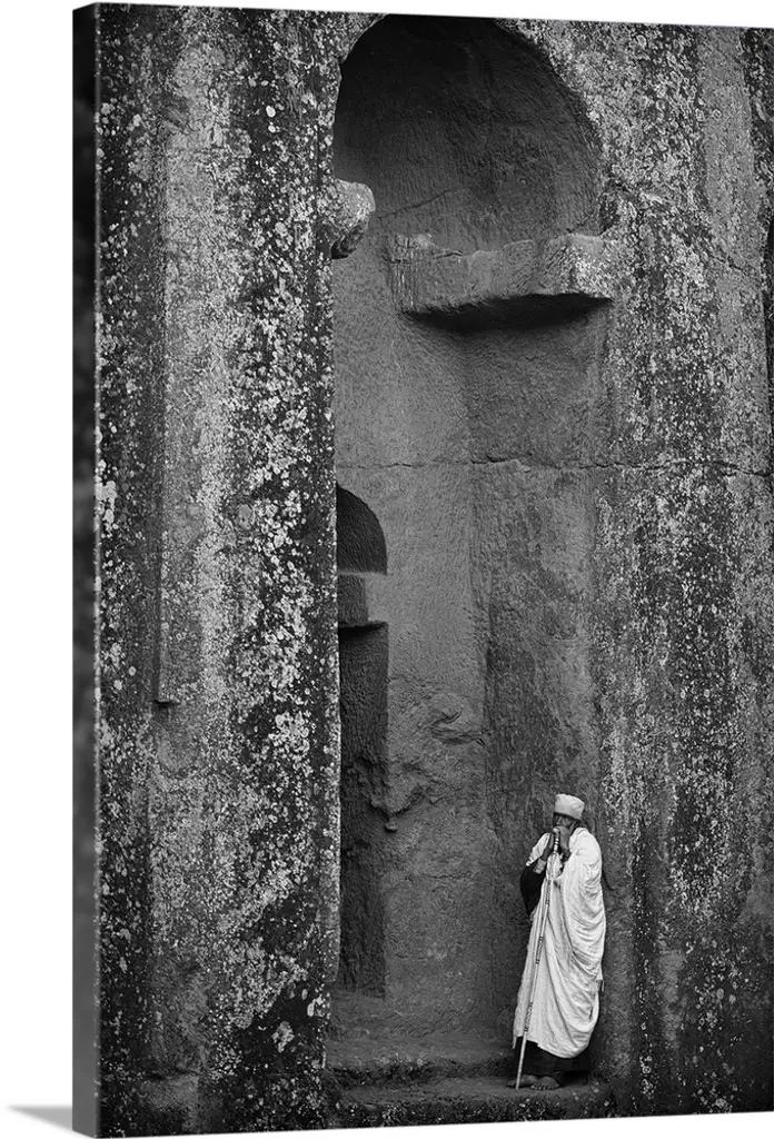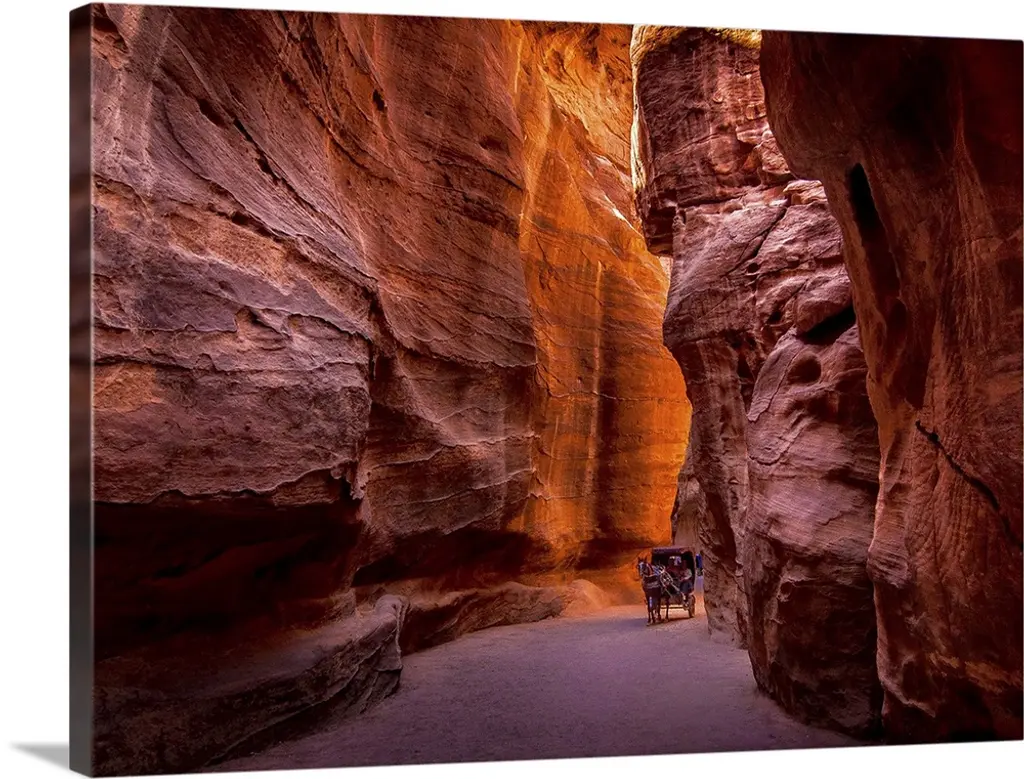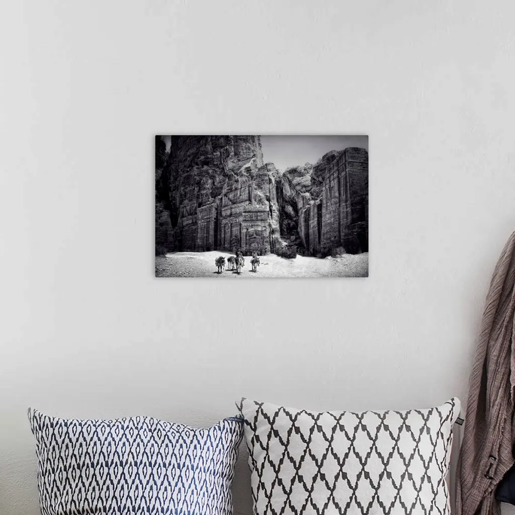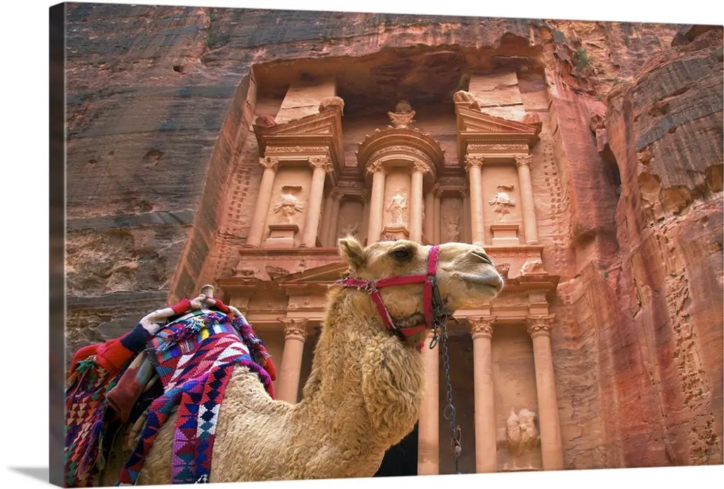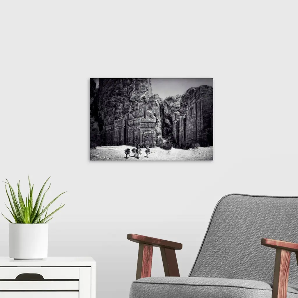 People with donkeys in front of the temple at Petra, Jordan, in the desert.