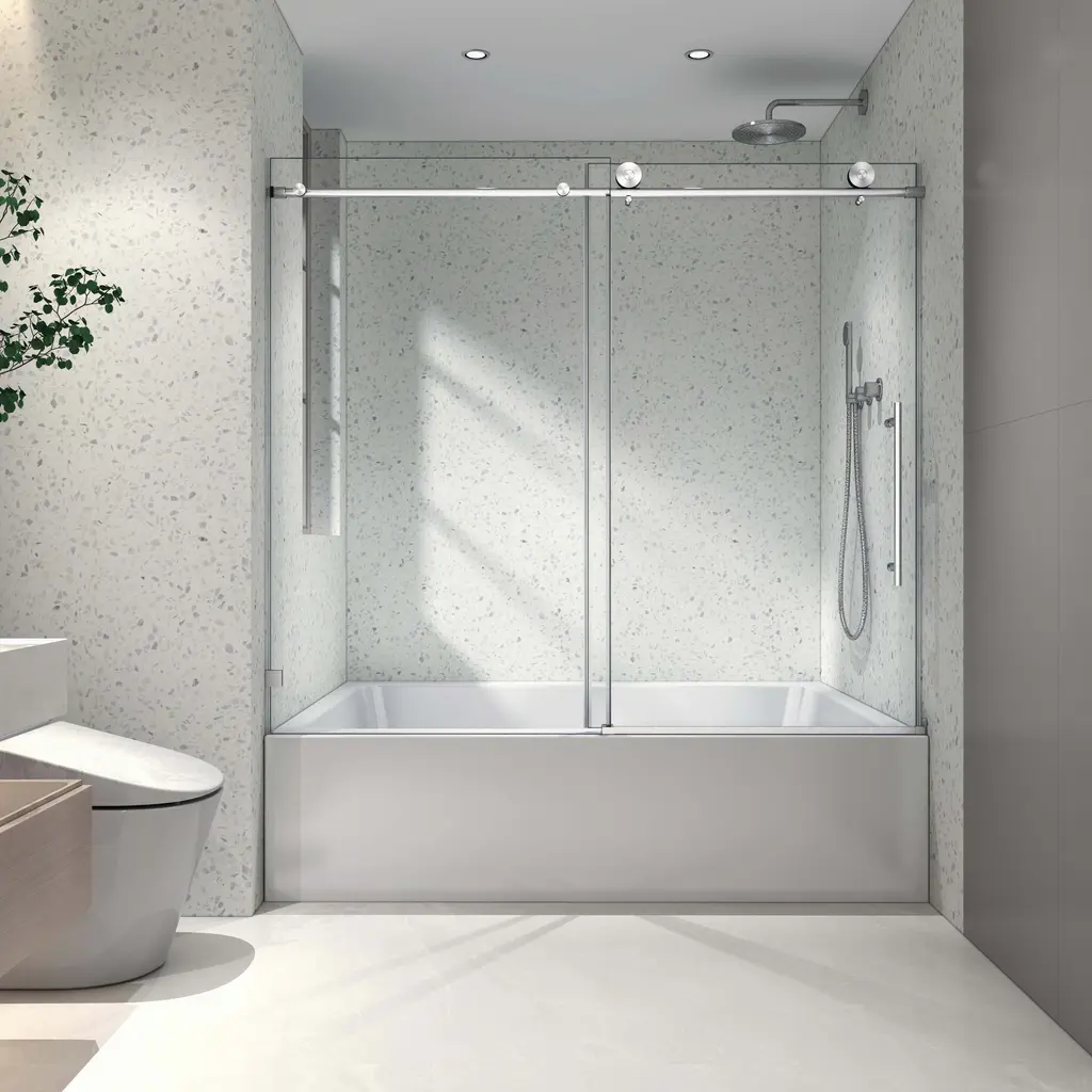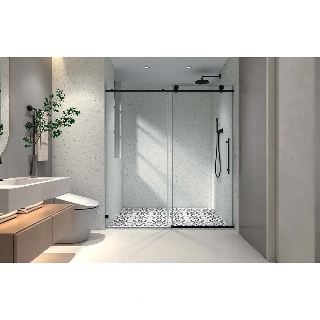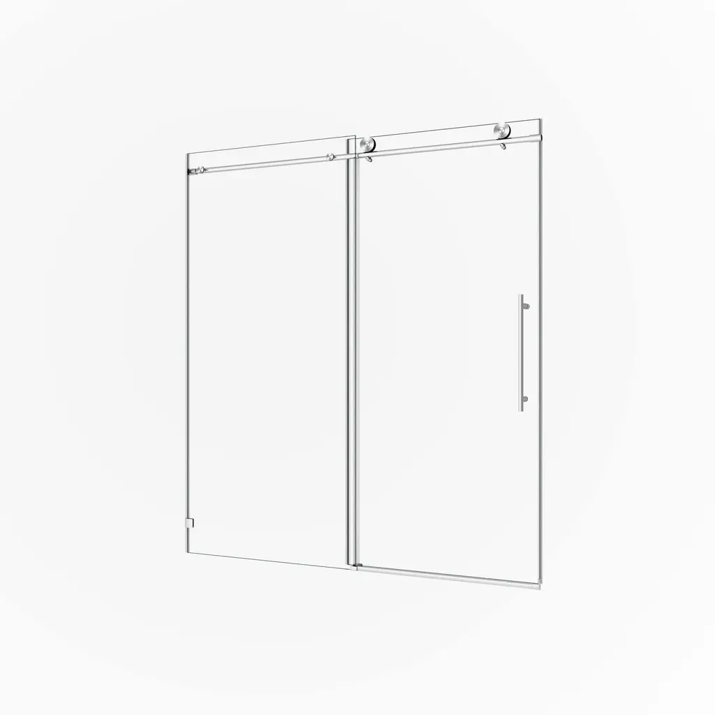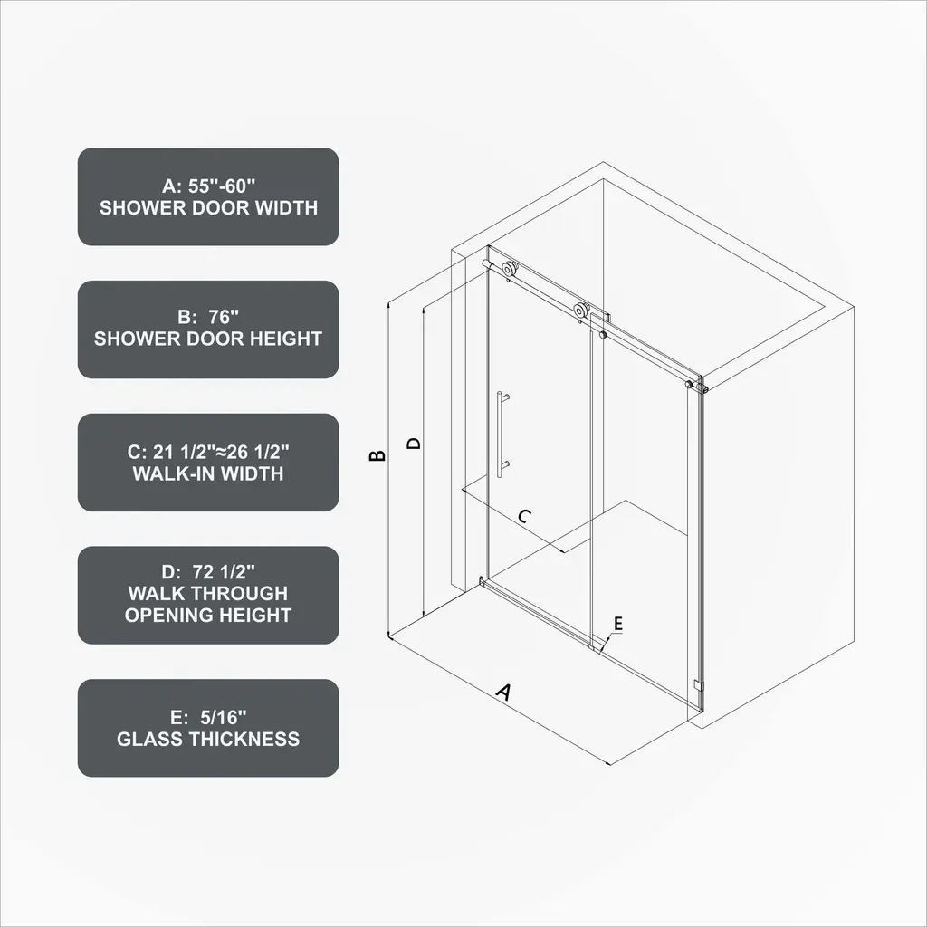 【Product Features】 ★5/16'' fully tempered glass (glass tested by ANSI Z97.1-2015 and certified by SGCC) with chamfered safety corner setting, one side of the glass is coated with nano-burst-proof film to minimize potential damage to the surrounding area in the event of an accidental impact, and the other side is made with nano-easy-to-clean treatment.Front side : with anti-explosion film. Backside: nano clean coating ★With soft-closing function, soft-closing function which is adjustable and works even after cutting 5 inches.And it can pass 50,000 times of door opening and closing test. Maximum permissible wall inclination 3/8''.60'' product is suitable for 55''(door space is 21.8'') to 60.8'' space,54'' product is suitable for 49''(door space is 16.8'') to 54.8'' space,48'' product is suitable for 44''(door space is 18.8'') to 48.8'' space .A drawing of the opening door dimensions is attache. ★Diameter 70MM pulley, 1'' round tube, excellent waterproof effect, all stainless steel 304 accessories are durable. The product is easy to be installed by one person, regardless of the left and right directions, with paper instructions and installation video. The products can be packaged in sets for express delivery, the weight, size and material of the outer box meets the express delivery standard, the outer box adopts splash-proof packaging and passes the anti-drop test. ★Products from 48" to 60" are fully covered. 6076 products are available in four colors: brushed, glossy, matte black and brushed titanium, 6076 products are available in frosted glass. 【This product is fragile, if there is any damage when you receive the goods, please take a photo and contact us, so that we can quickly verify and deal with you】 【Notes】 1.Size Notice:Manual measurement has been used, there may be some reasonable errort, thanks for your understanding. 2.Color Notice:Due to factors such as display equipment and shooting environment, the color of the item may be slightly different from the picture, which is a normal phenomenon, please refer to the actual item 3.Assembly Notice:Please read assemble manual in advance. Please do not over-tighten nuts, as this may cause distortion or breakage. 4.It is recommended to put a layer of foam or soft cushion on the floor when installing to avoid scratching the floor. 5.If the item has any defects, damage or missing parts, please contact us with pictures or videos so that we can understand your needs and help you quickly, and always remember to retain its original packaging to ensure any return requests. We will try our best to solve any problems you may have. 6.If you receive the wrong product, please attach the product picture, the infographic of the outer package and the picture containing SKUs, so that we can verify and quickly deal with it for you