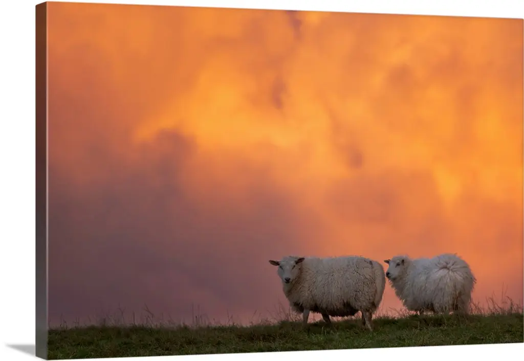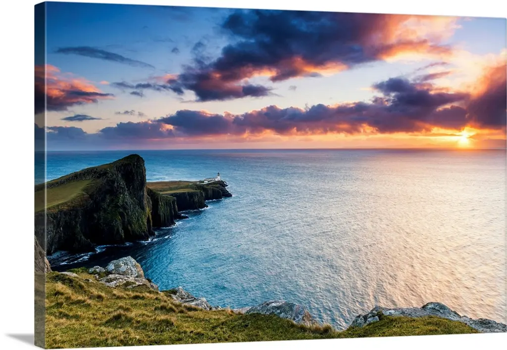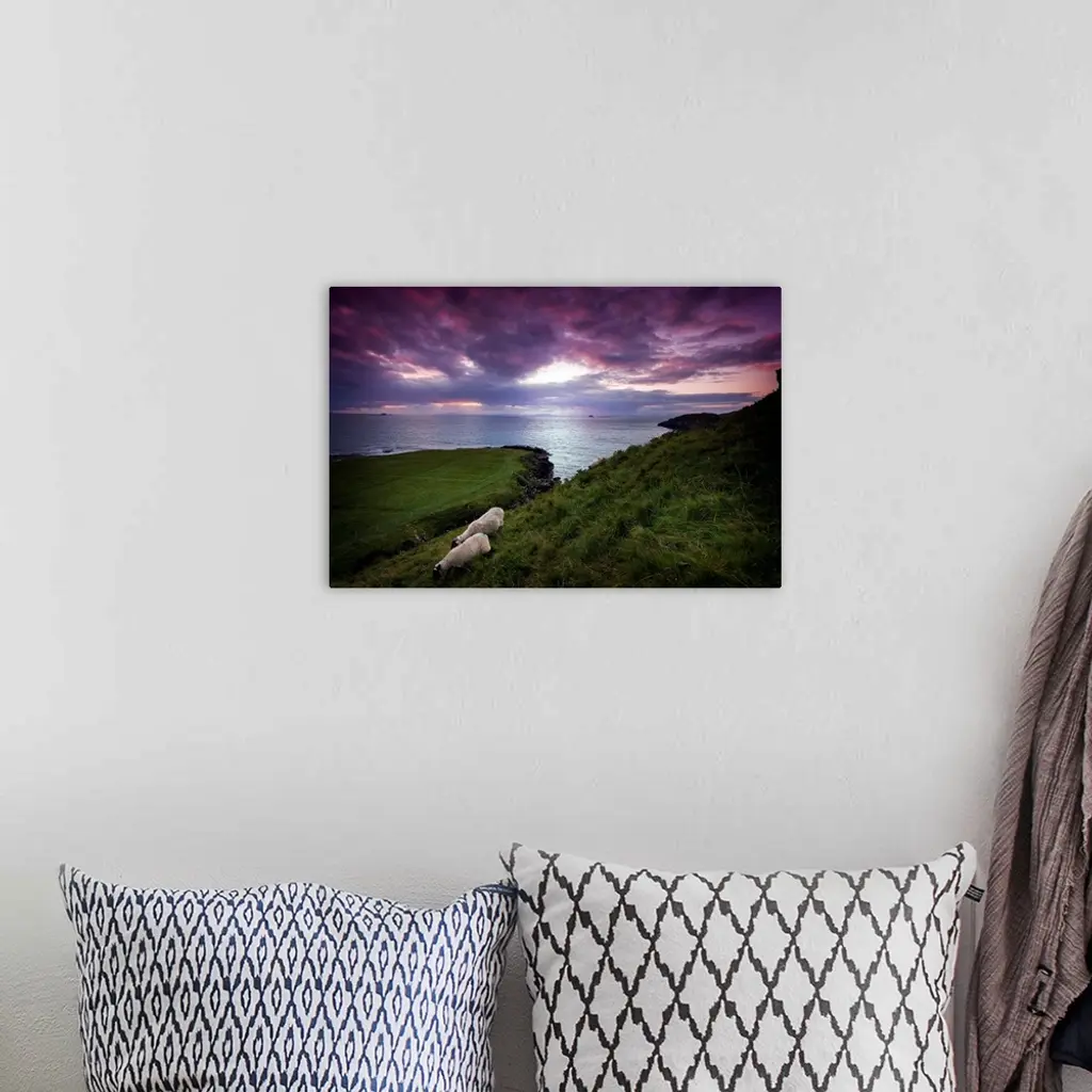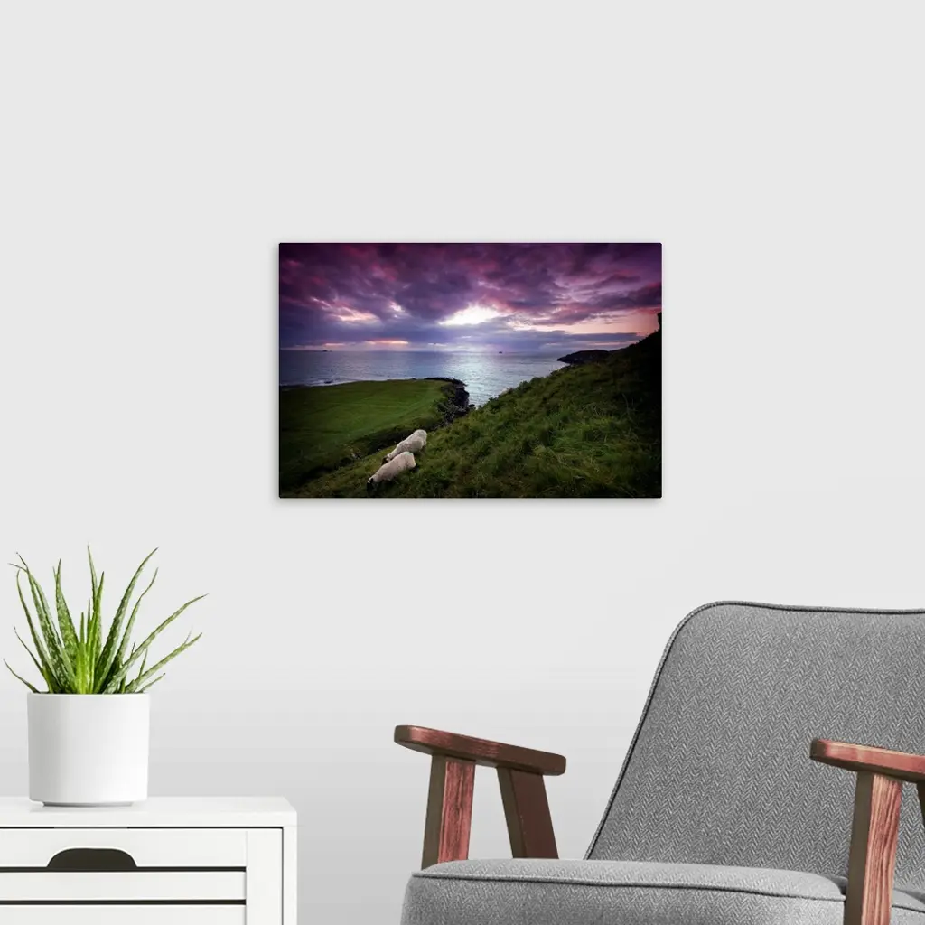 Fine art photo of grassy hills overlooking the sea under a pastel sky at dusk.