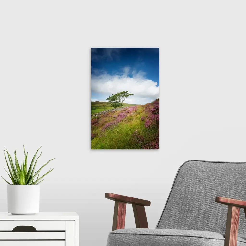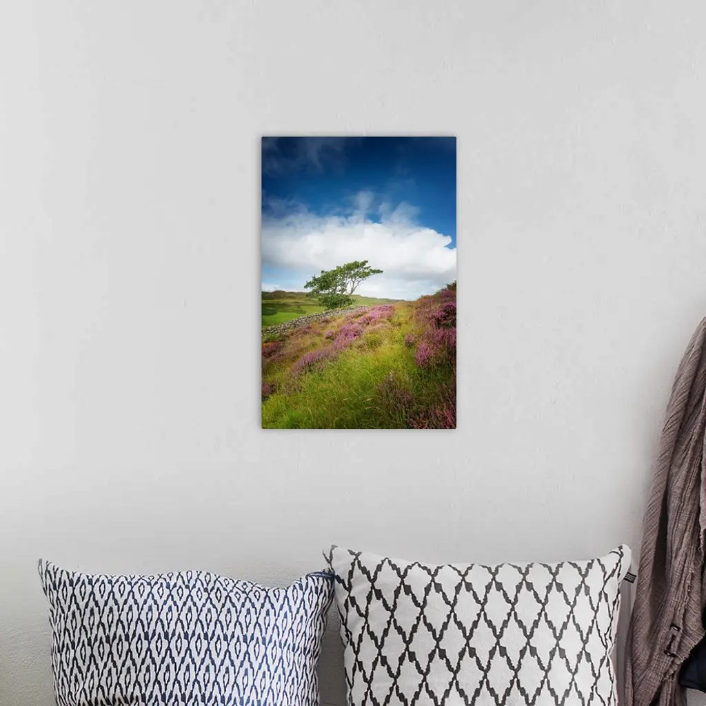 Fine art photo of a tree at the edge of a field of wildflowers under a cloudy sky.