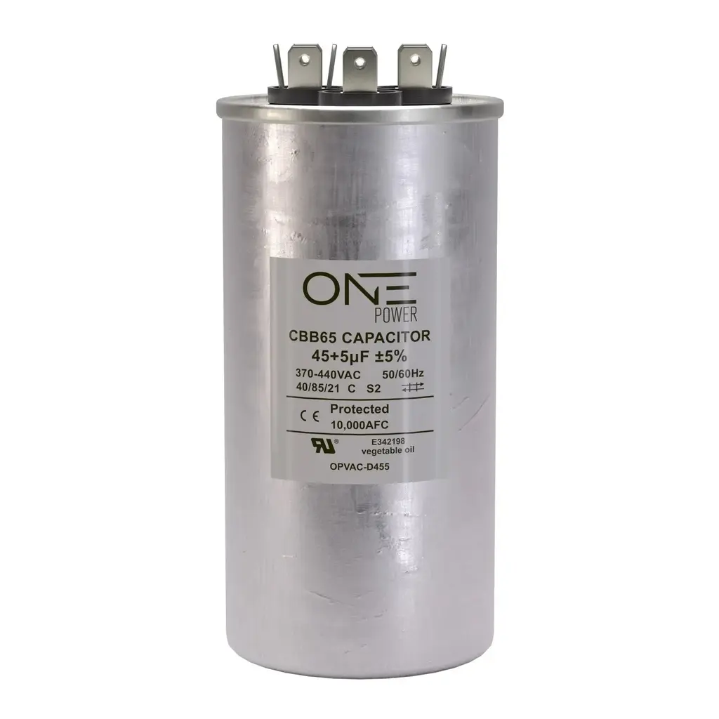 The ONE Power CBB65 capacitor is a reliable and efficient solution for your electrical needs. This round, double-run capacitor is designed for 440-volt applications and has a capacitance of 45/5 microfarads (MFD) with a tolerance of ±5%. It operates at a frequency of 50/60Hz and a temperature range of -25°C to 85°C. Measuring 10.00 MFD, this protected capacitor is ideal for use in various industrial and commercial settings. With its durable construction and high-quality materials, it ensures consistent performance and longevity. Upgrade your electrical system with this ONE Power CBB65 capacitor for optimal efficiency.✅Durable Construction: This CBB65 capacitor is built with high-quality materials, designed for long-lasting performance and reliability. ✅Specifications: 45/5 MFD capacitance, 440V AC rated voltage, 50/60Hz frequency, and a case size of 1.97-in W x 4.72-in H. ✅Wide application environment(widely used in air conditioners, air compressors, motors, refrigerators, heat pump capacitors, HVACs, generators, lighting lamps, fans, etc). ✅Water proof function (encapsulated with Aluminum body). ✅High temperature resistance (up to 85 degrees Celsius) Low temperature resistance (low to 40 degrees Celsius) Fully certified by UL. ✅Protected Design (With explosion-proof design): Features a protective casing to safeguard against electrical hazards and environmental factors.