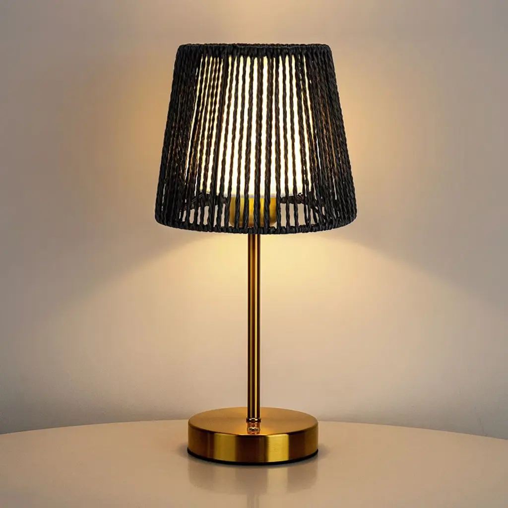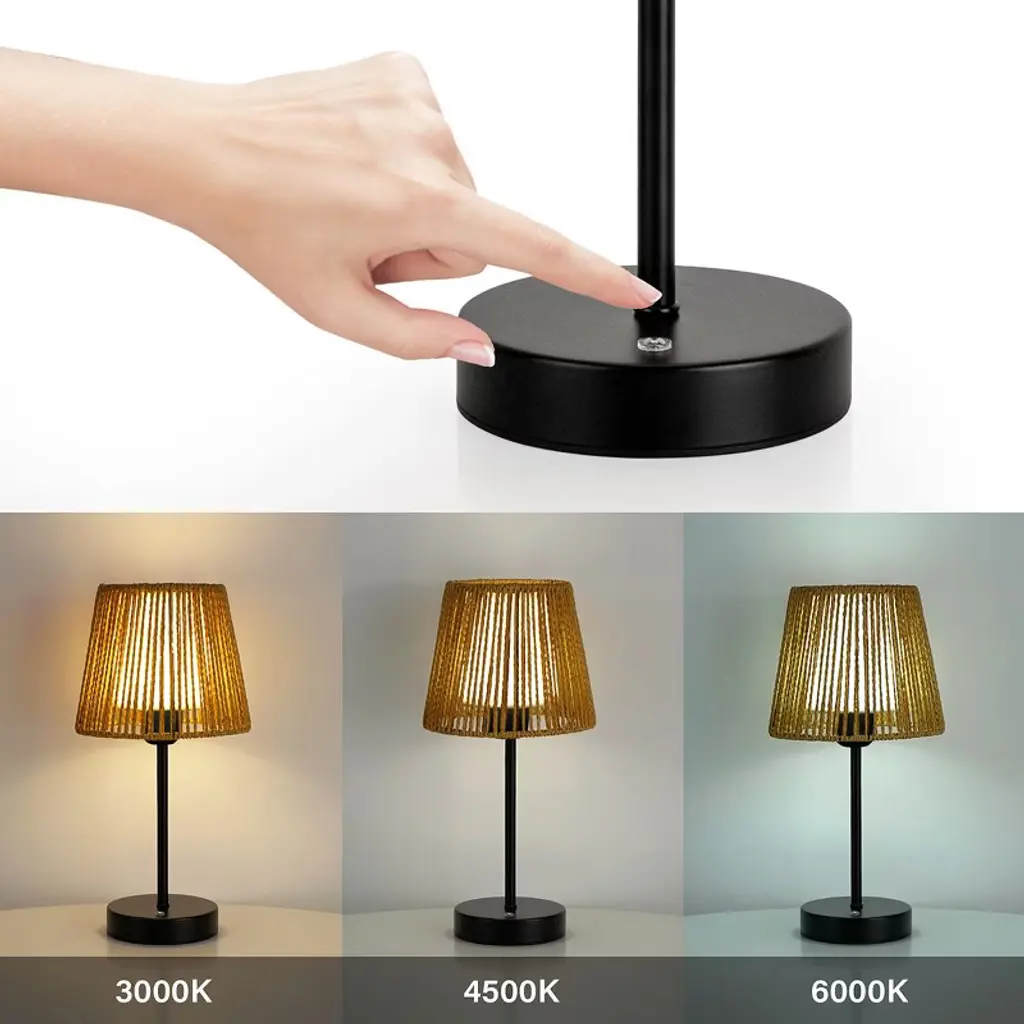 Onewish Portable Metal Table Lamp for Indoor/Outdoor ,Rechargeable Cordless LED Lamp, 3-Colour Infinitely Dimming Battery Powered Small Desk Lamp, Stringing Textile Shades with retro and elegant style , It is a multipurpose lamp,ideal for home decor, living room, bedroom, balcony, night stand, dinner table, outdoor party, backyard, BBQ, ambience lighting, etc.