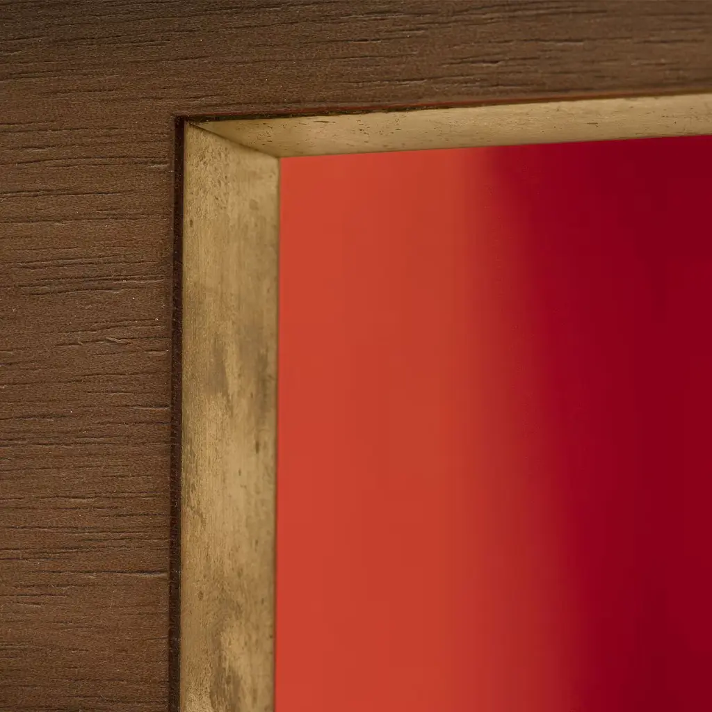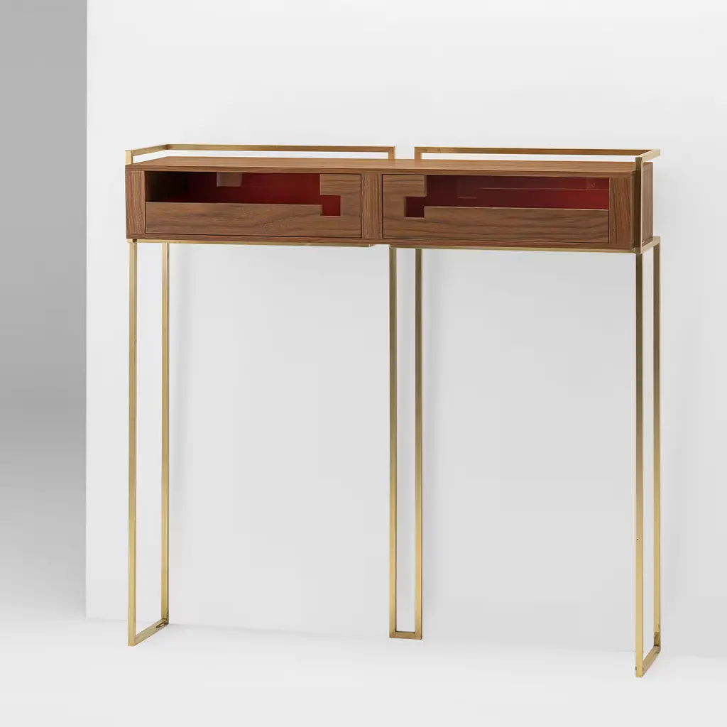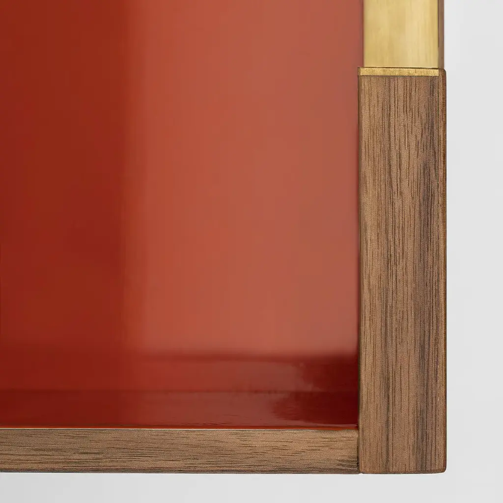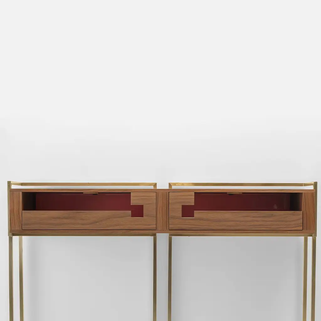 A console with drawers, inspired by the architecture of Carlo Scarpa and the design of the 1960s. Elegant and precious, the console is carefully designed with attention to detail: the edges of the front cut-out of the drawers are finished in brass set into the wood; the inside of the drawers is manually lacquered in deep orange. The proportions emphasize the design of the brass structure, which is the result of manual soldering. The wood used is Canaletto walnut folder treated with natural oil. The brass is also natural.
