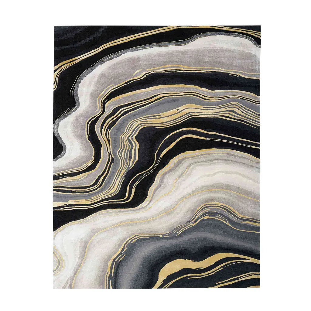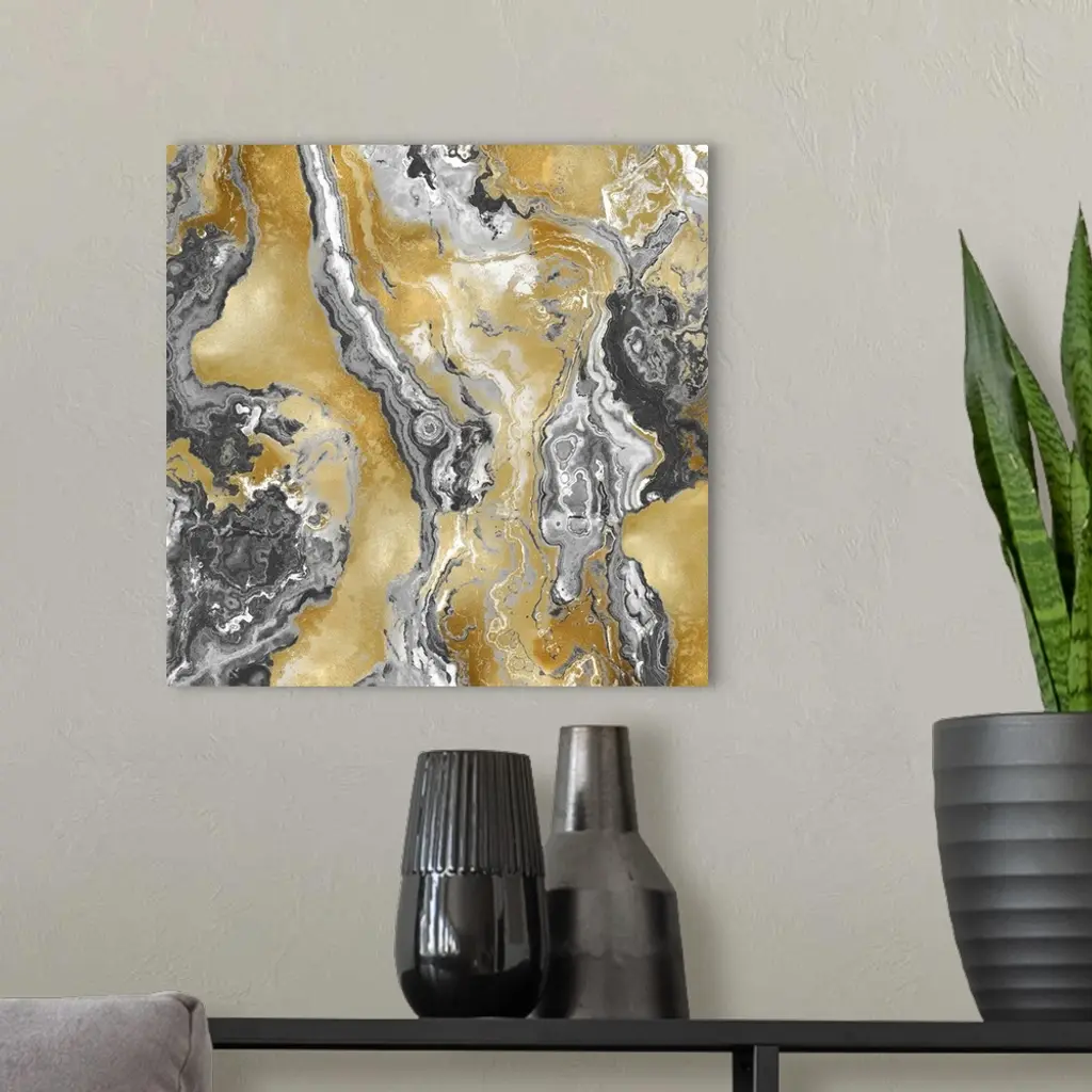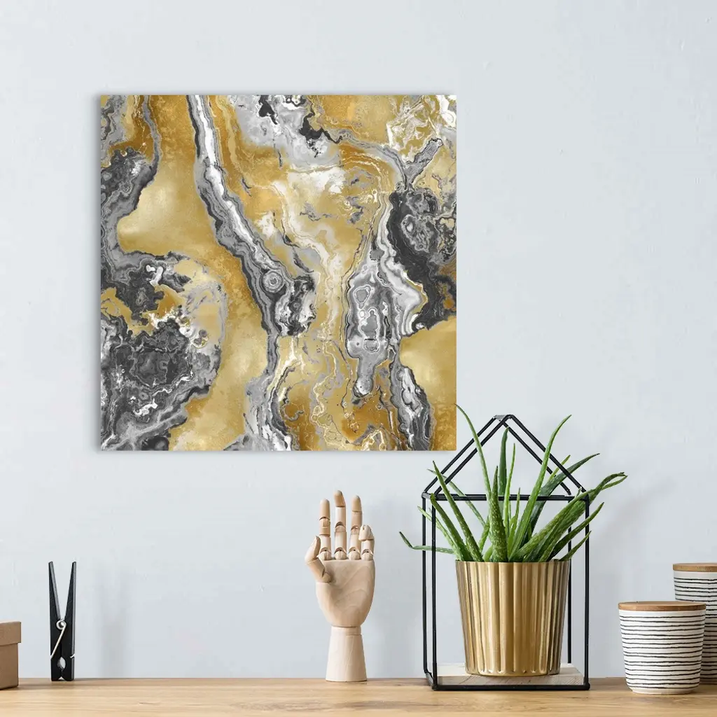 Square abstract decor with a gold, gray, silver, and white onyx design.