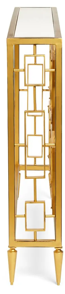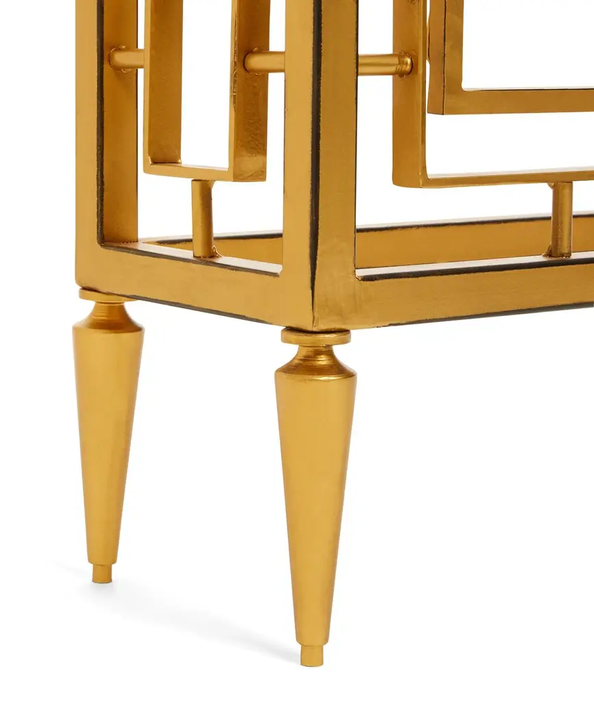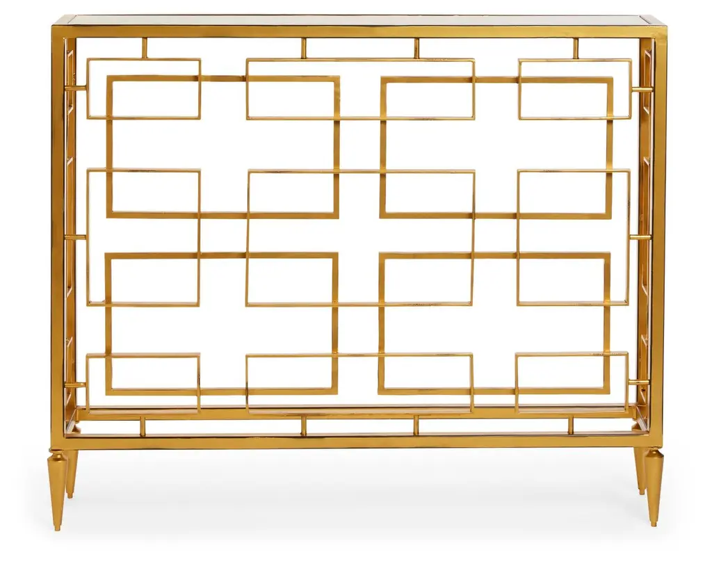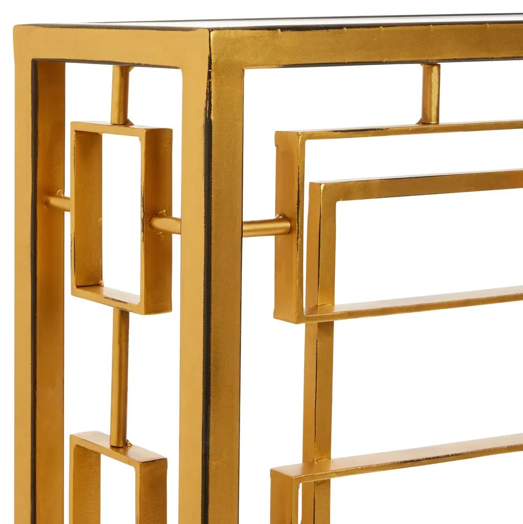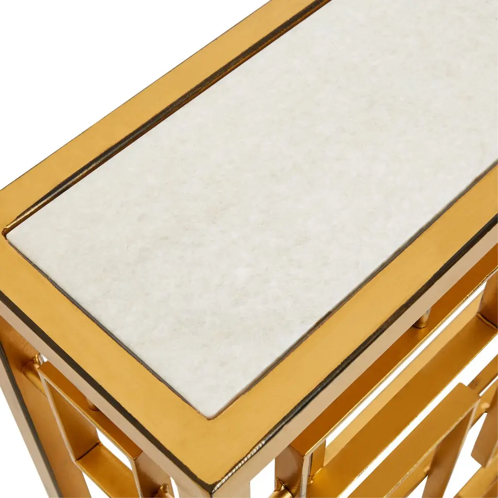 The open design and geometric motif of this iron console bring striking visual appeal to an entryway, bedroom, or living space. A stone top and golden finish accentuate its lavish style.