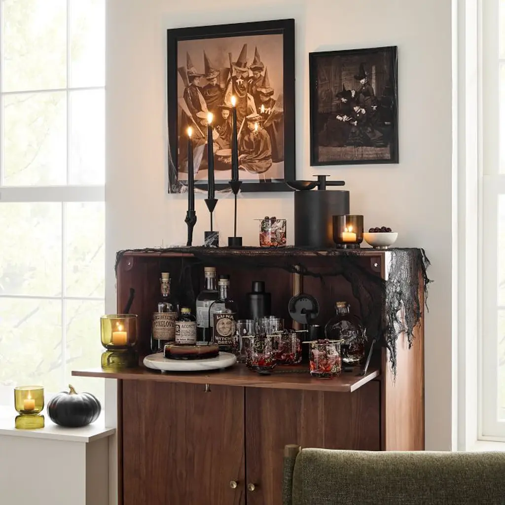 The look includes: Spooky Glassware, Streamline Metal Barware, Foundations Glass Candleholders, Black Pumpkin Objects, Hammond Antique Bronze Taper Holders and Metal Snake Taper Holder. For individual product information: Spooky Glassware, Streamline Metal Barware, Foundations Glass Candleholders, Black Pumpkin Objects, Hammond Antique Bronze Taper Holders and Metal Snake Taper Holder.