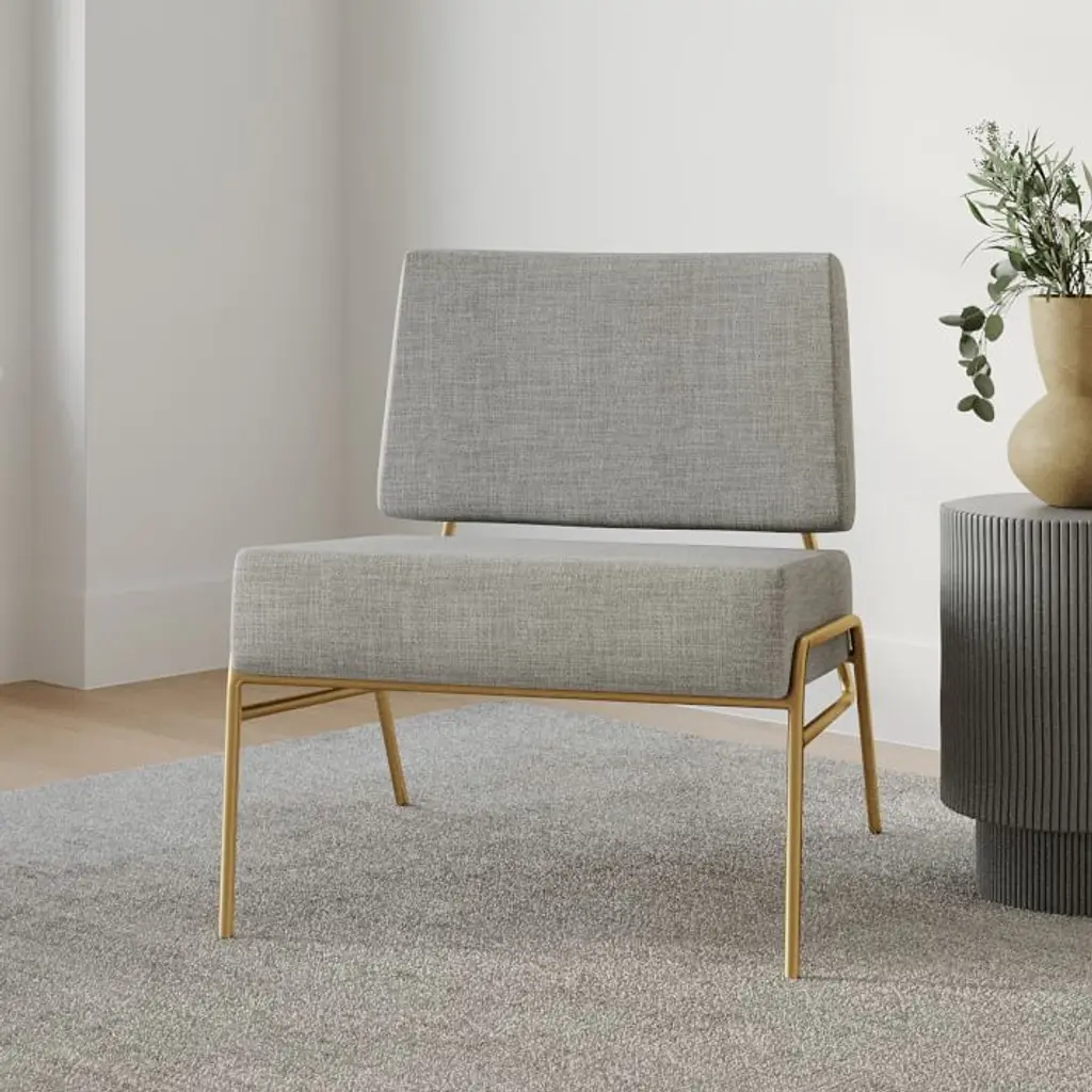 Our airy and modern Wire Frame Slipper Chair is an easy, go-anywhere piece at an even easier price. Its low, open profile makes it a comfy choice in spaces big or small and its Contract Grade frame means that it's extra sturdy. Upholstered cushions (fixed). Powder-coated iron frame. Seat and back cushions are foam and fiber filled. Seat firmness: Medium. On a scale from 1 to 5 (5 being firmest), it's a 3. This contract-grade item is manufactured to meet the demands of commercial use in addition to residential. See more. Imported.