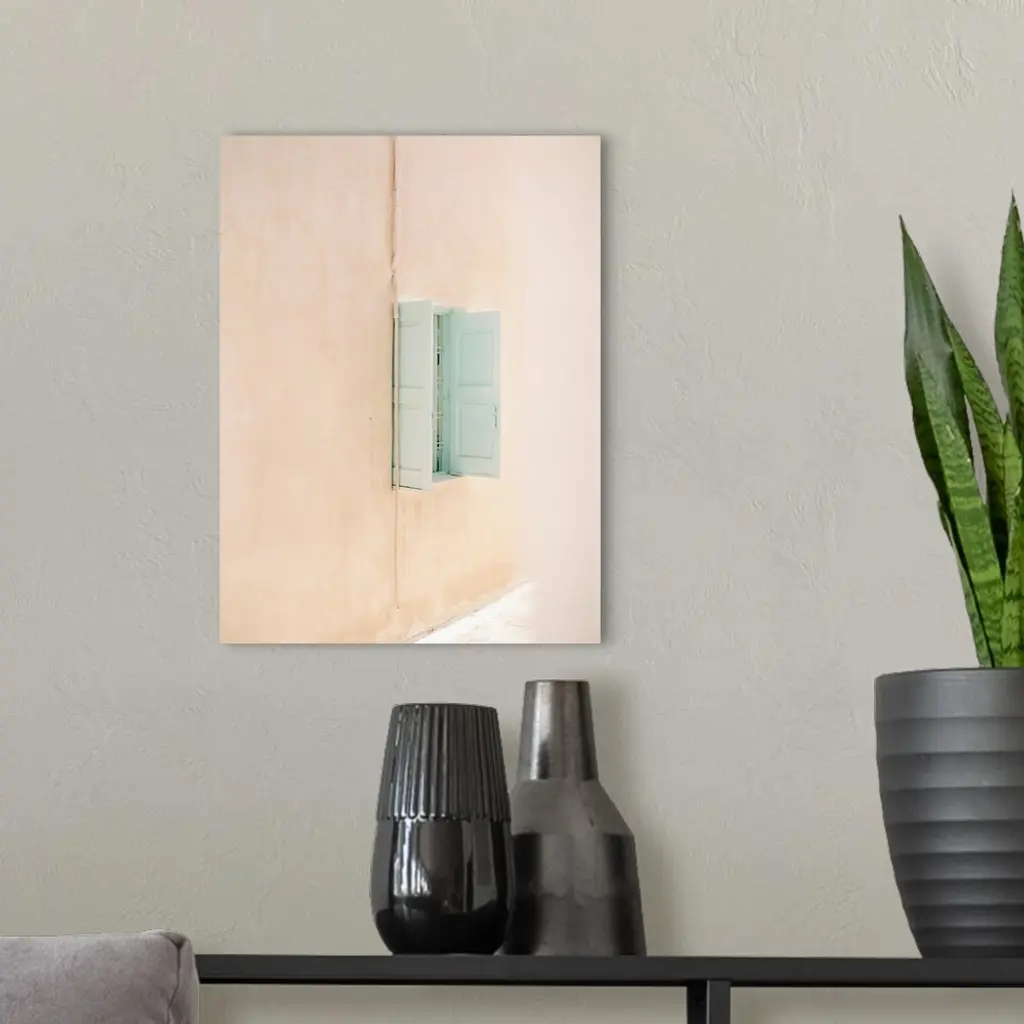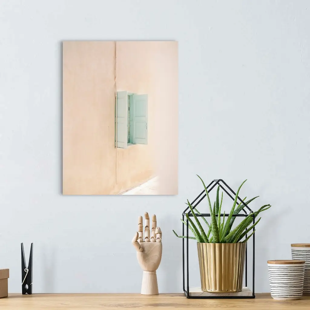 Photograph of a small window with pale blue shutters in a peach colored wall.