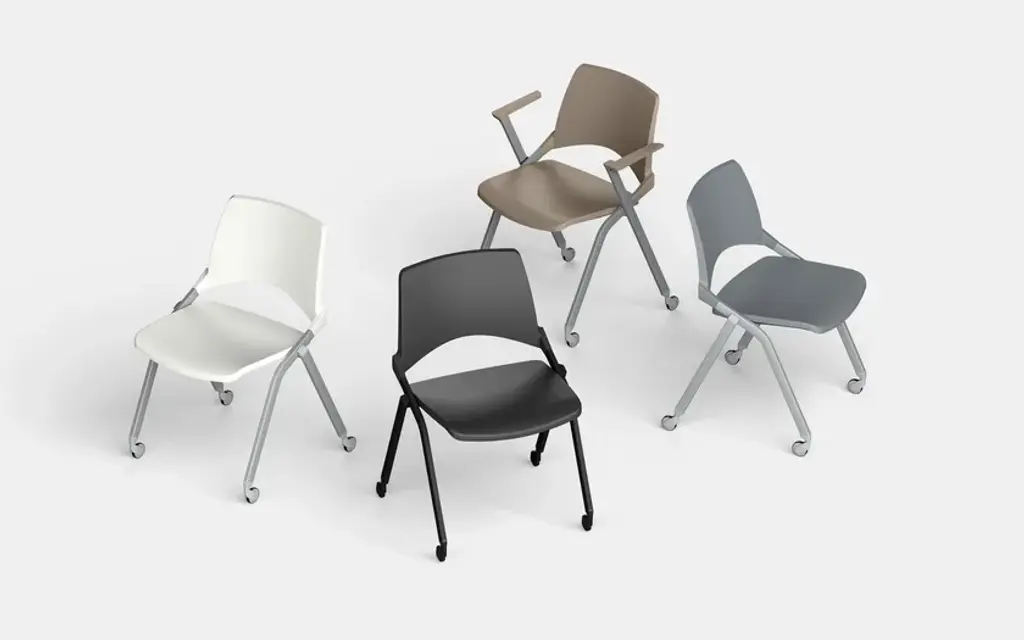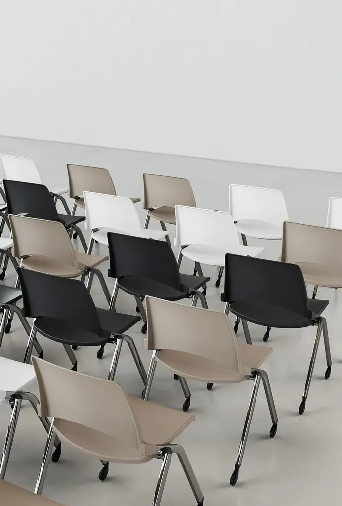 Oplà is the flexible and functional chair with armrests and writing-tablet, designed by IBEBI to furnish offices and schools. Particularly suitable for training and conference environments, this chair combines practicality and comfort in a single intelligent design. One of Oplà’s distinctive features is the tip-up seat, which allows it to be stacked both vertically and horizontally, optimising space and facilitating the management of classrooms and any occasion where it is invaluable to be able to dynamically configure spaces, also thanks to the base on castors. Made with backrest and seat in polypropylene and frame in steel tube, Oplà has a practical and functional anti-panic writing-tablet in ABS, with options also for left-handed people. Customisable with numerous finishes, colour variants and optional features, this stackable chair with armrests, writing-tablet and castors adapts to different needs and styles in a versatile way.