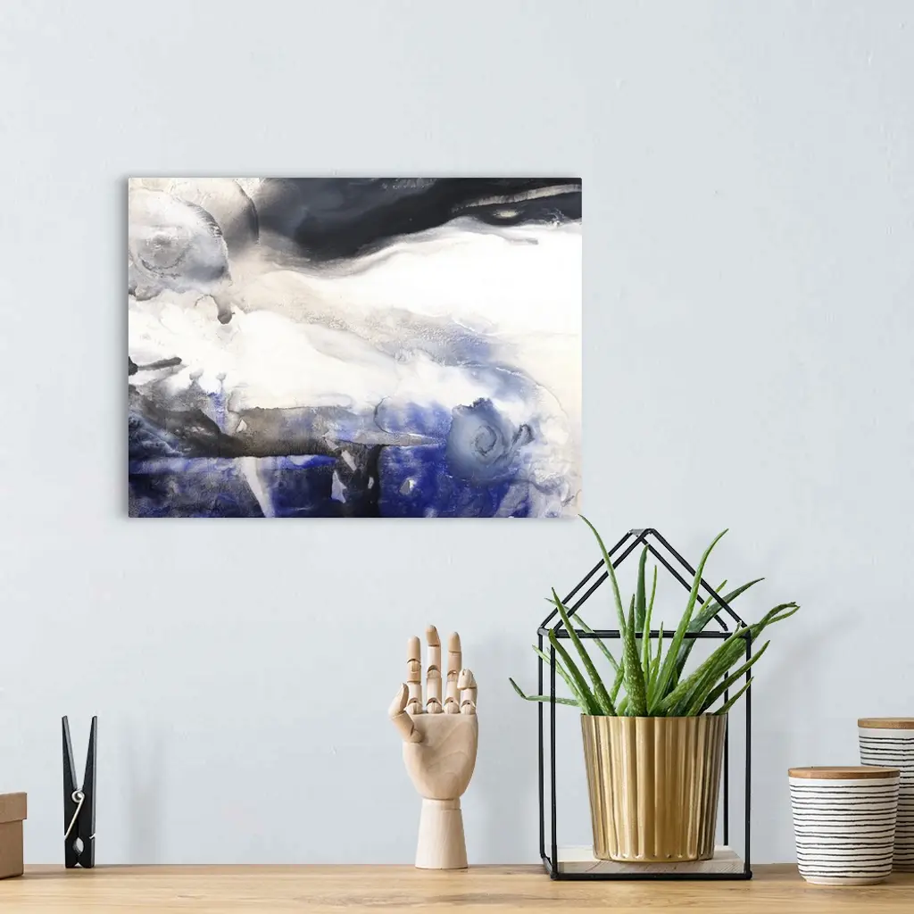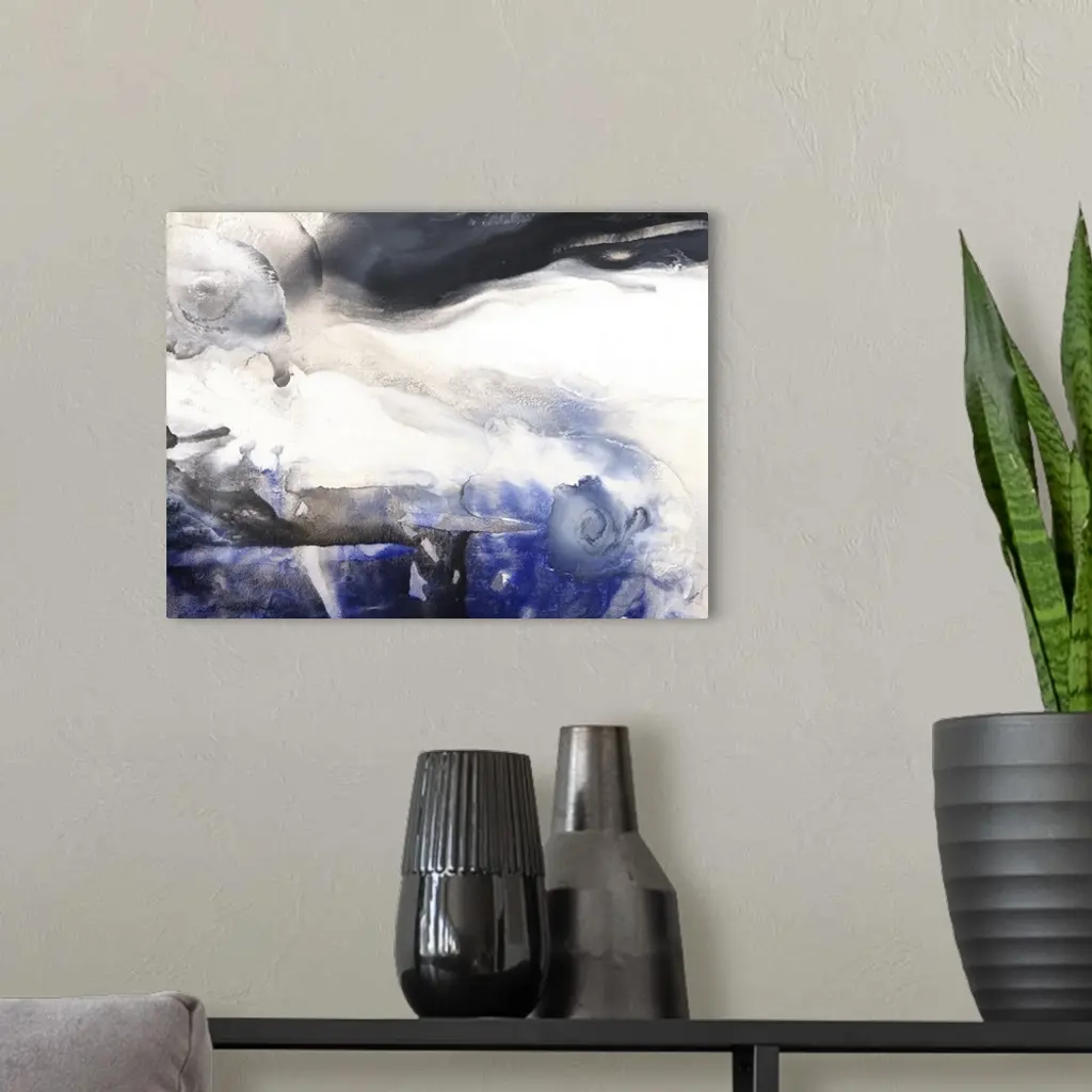 Whirled colors of white, black and blue, giving the impression of a thunderless storm.
