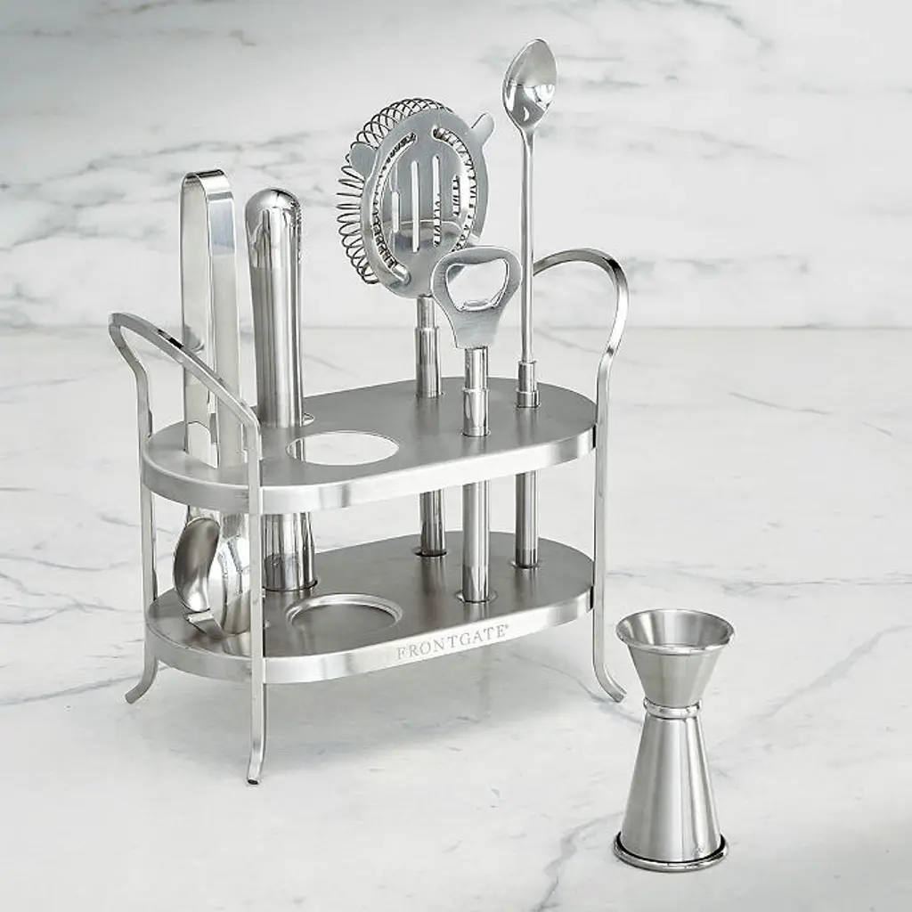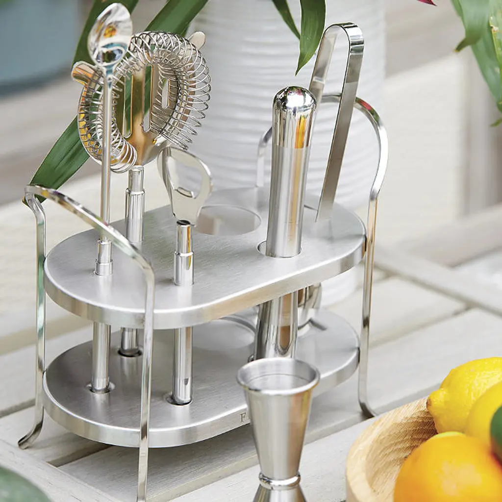 This professional-quality bartender set has everything you need to become a master of mixology. Each piece, including the stand, is crafted of heavy-duty stainless steel so it won't rust and will last for years. Get this stylish set for your home bar or give one as a housewarming, wedding or host gift. 100% stainless steel Set includes double jigger, ice tongs, muddler, strainer, bottle opener, mixing spoon and stand For indoor or outdoor use Hand wash only Do not use abrasive cleaners Do not soak in water A Frontgate exclusive. At Frontgate, our primary focus is quality. We guarantee that every product we sell will stand up to the supreme test – our customers' satisfaction. To learn more about our policies, visit our Shipping & Processing, Returns & Exchanges and Warranty & Price Guarantee pages.
