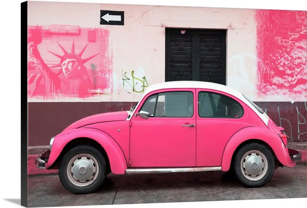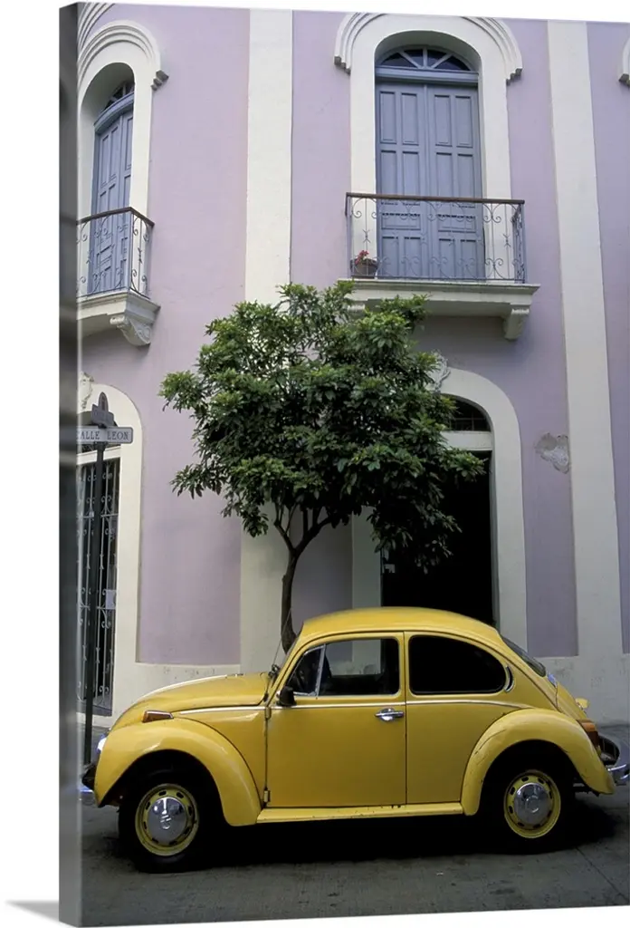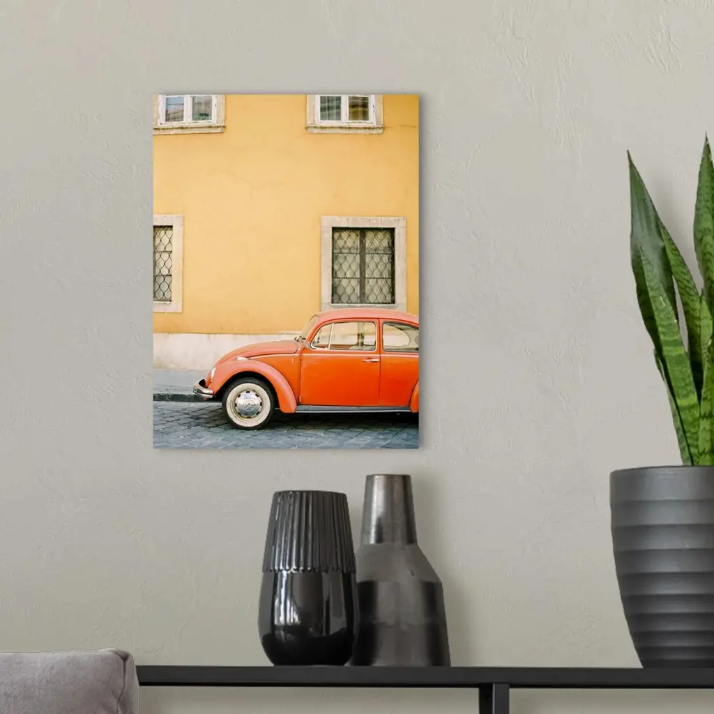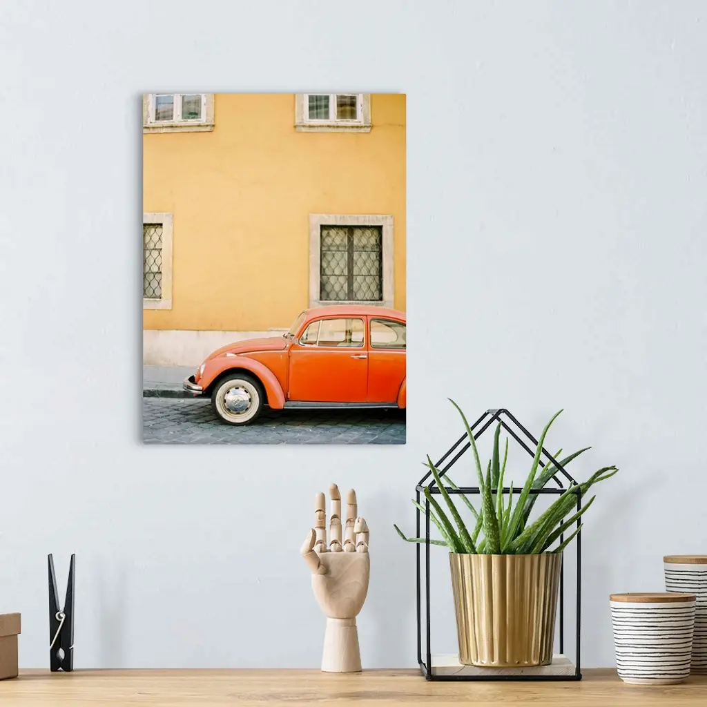 Photograph of an orange Volkswagen Beetle car parked in front of a yellow wall, Budapest, Hungary.