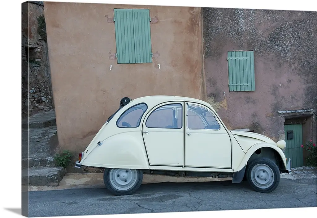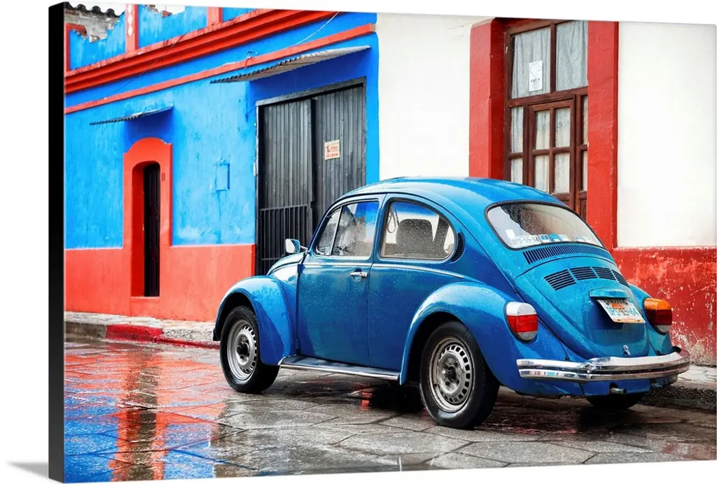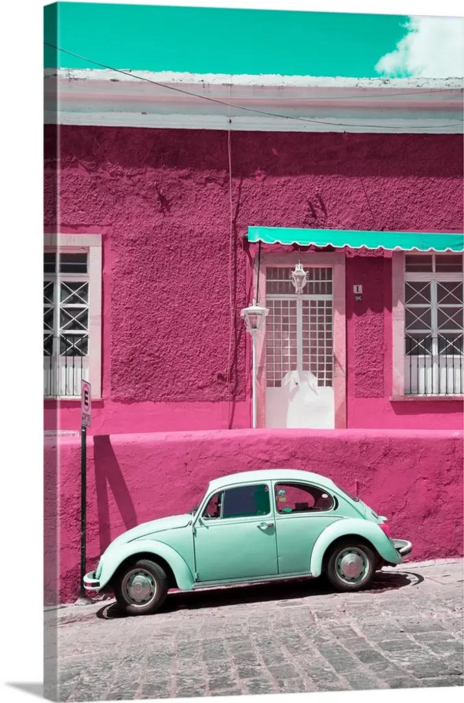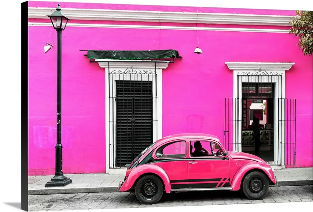 Photograph of an orange Volkswagen Beetle car parked in front of a yellow wall, Budapest, Hungary.