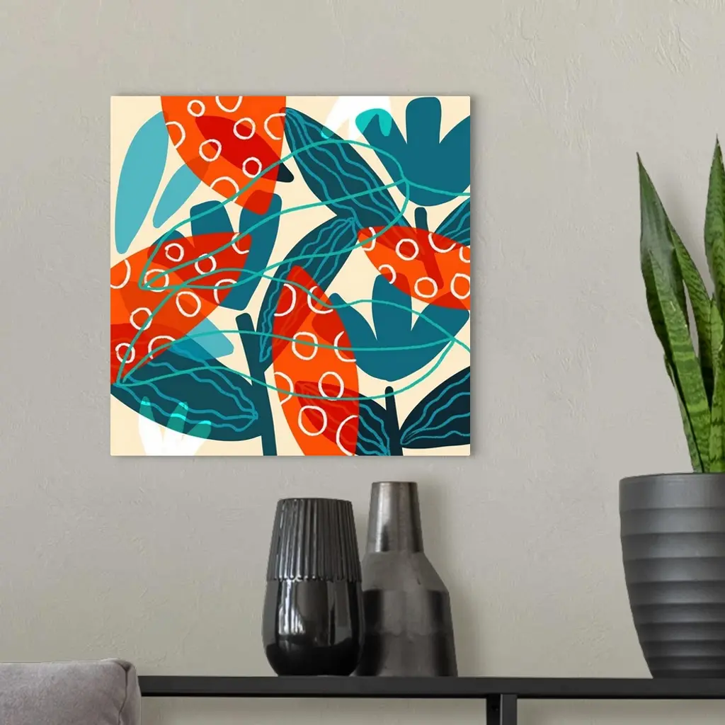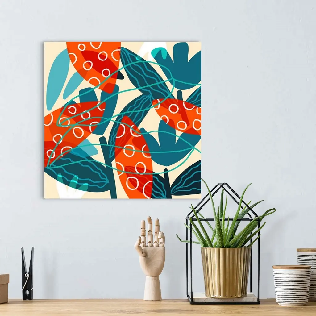 A bold Mid-Century graphic illustration of orange and blue leaves which makes a big statement for any room