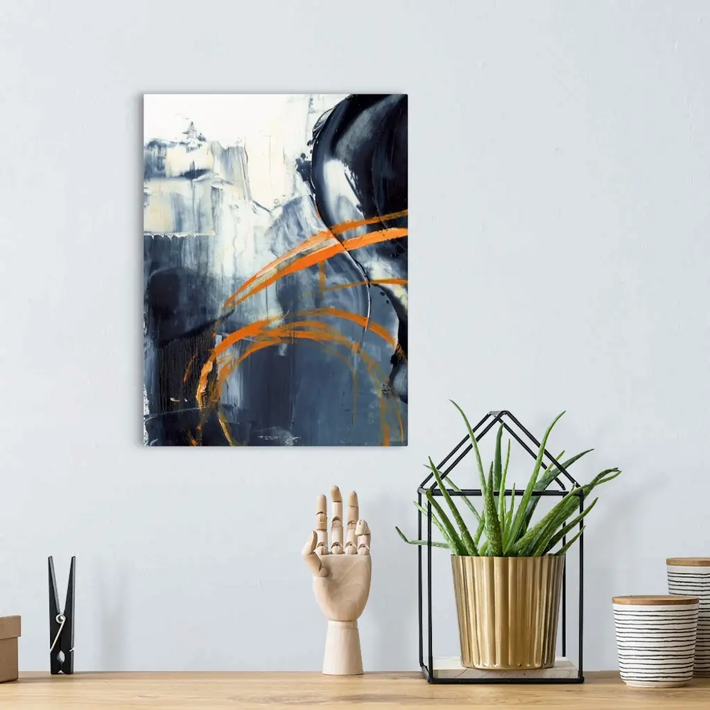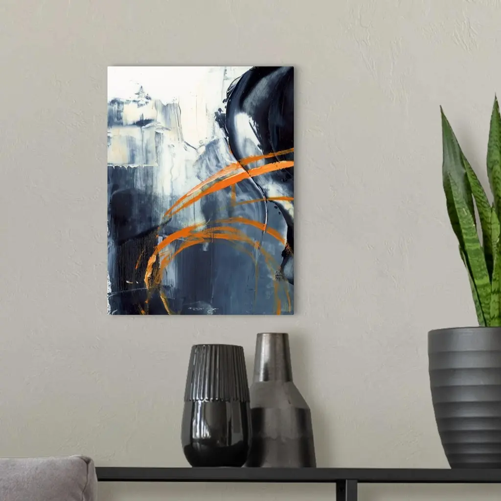 A bold contemporary statement piece in shades of dark indigo accented with streaks of bright orange. It's masculine strength would stand out in a modern docor scheme, perfect for a loft or minimalist setting.