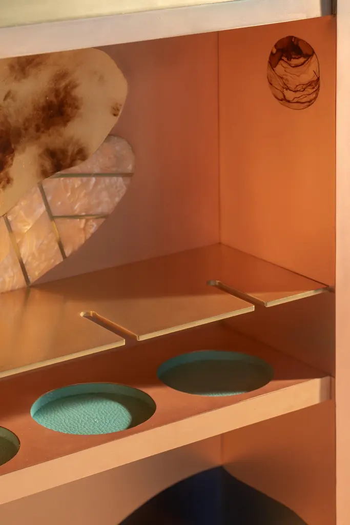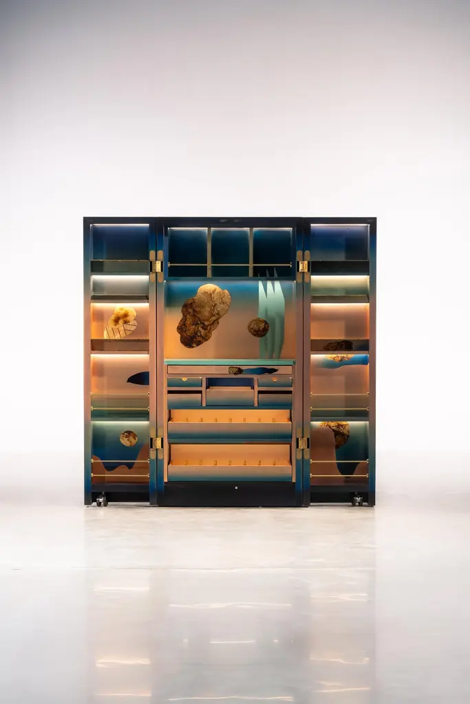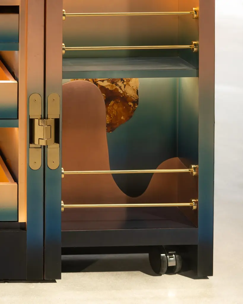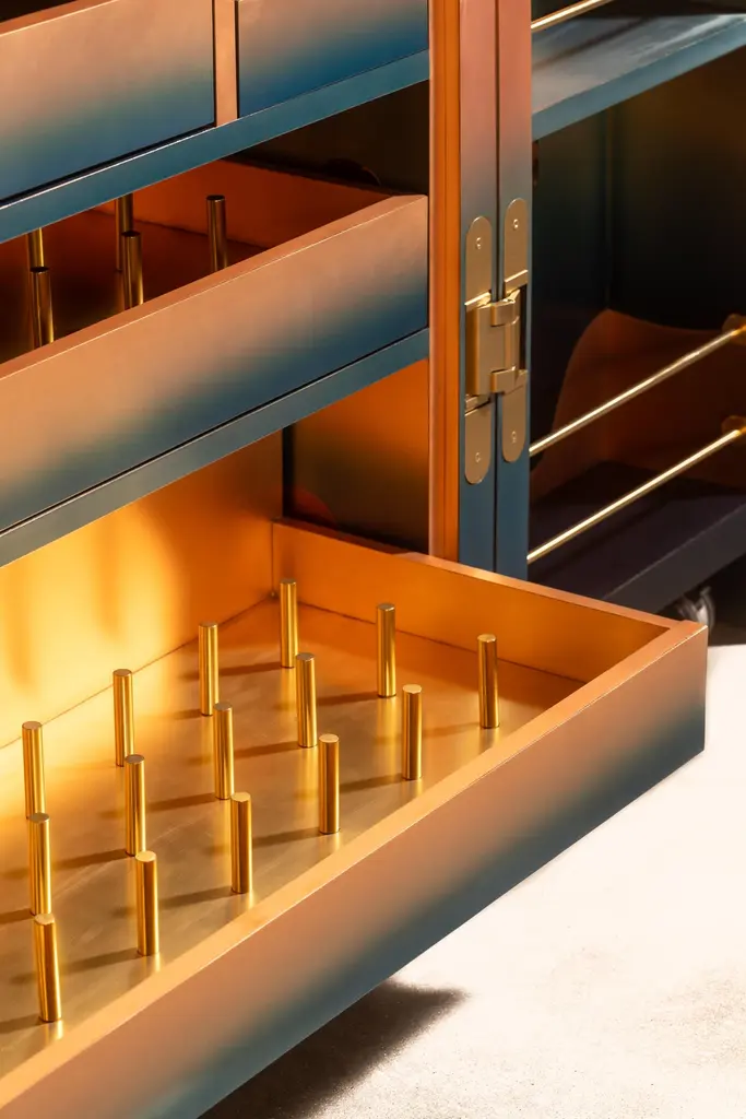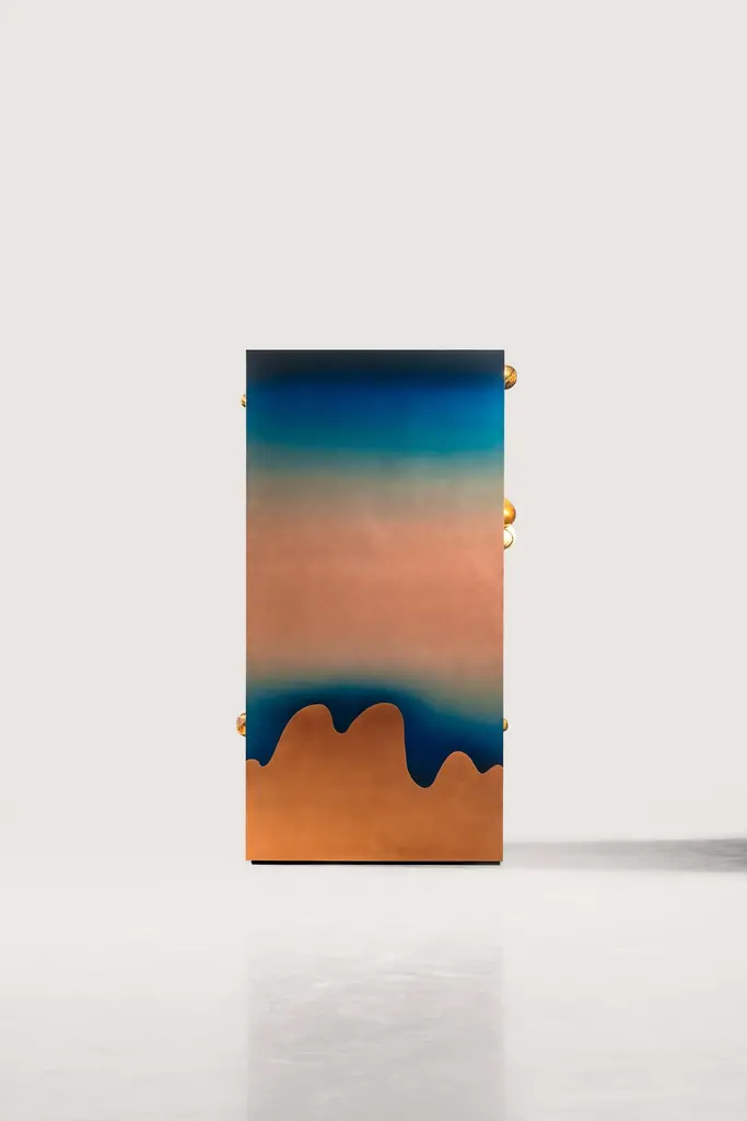The Orbit Bar is a mastery in abstract design with floating planets against coppery blue skies and intricate interiors to hold a full bar. Transform your home with this elegant and timeless cabinet with drawers and shelves to house your collectibles. Can be customised in size, finish and interiors according to specifications. Please note: Each piece exalts the handmade, the painstakingly crafted, the authentic. A piece may have slight variations and tiny imperfections but these are the marks of an artisan, a testament to the individuality of each work of art. It is our belief that these variations infuse our objects d'art which desire and we assert our right to make the necessary qualitative changes. Prices do not include VAT. VAT may be applied depending on the ship-to location.