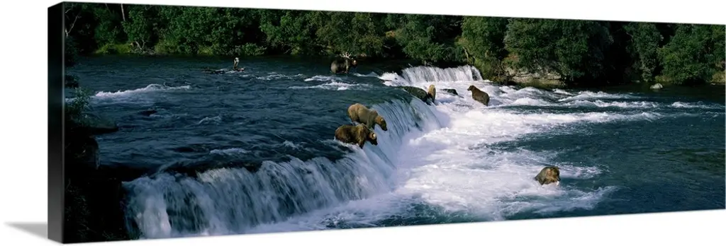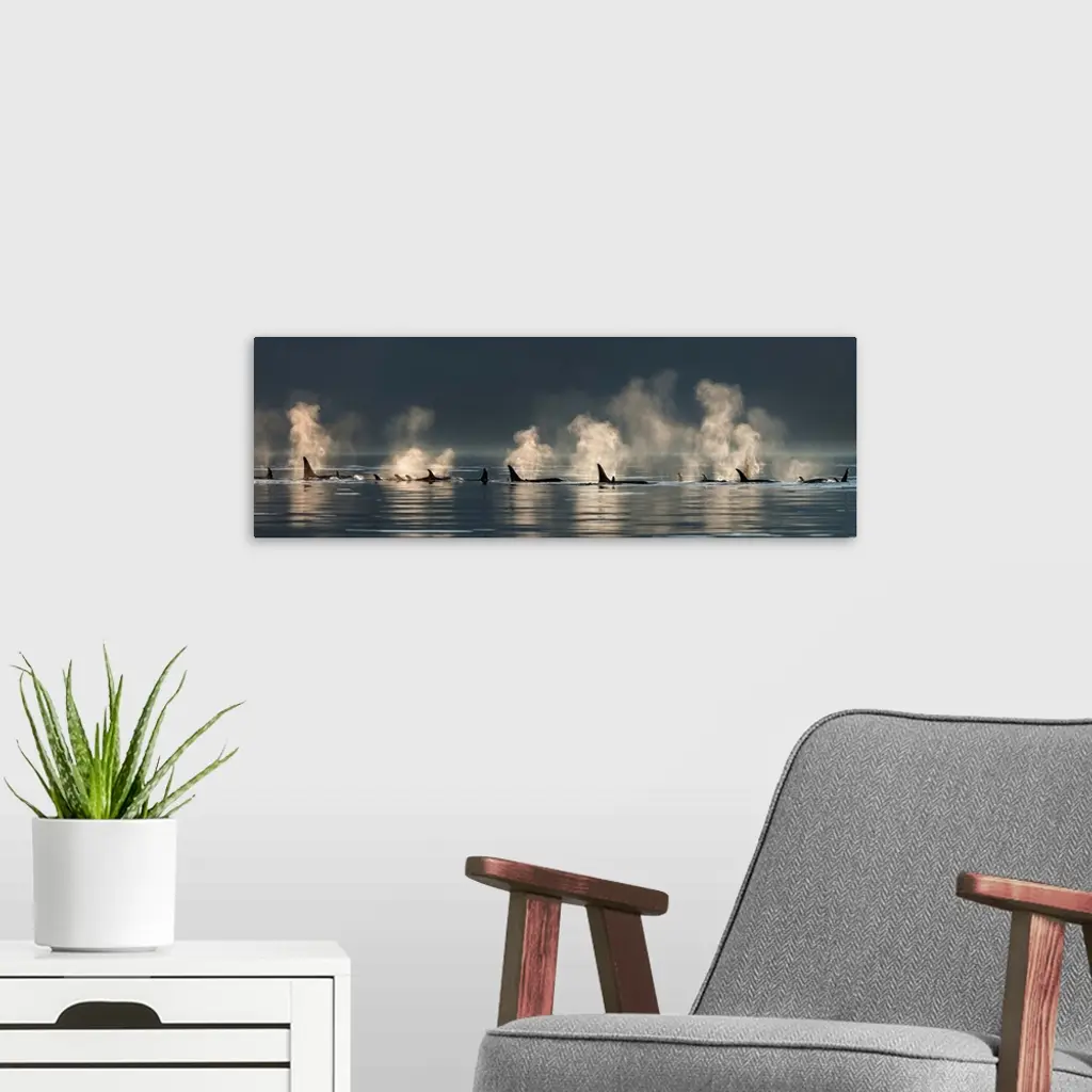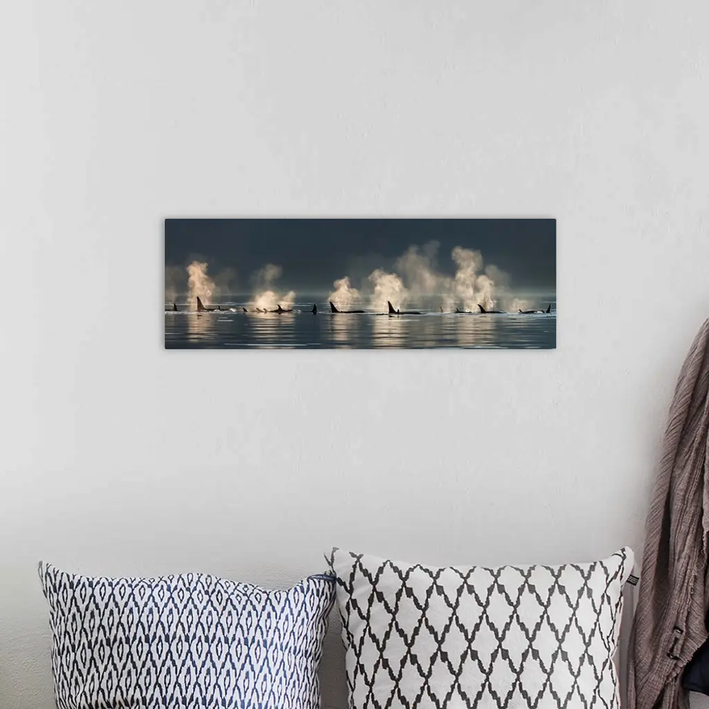 A group of Orca (killer) whales come to the surface on a calm day in Lynn Canal, Alaska, near Juneau.