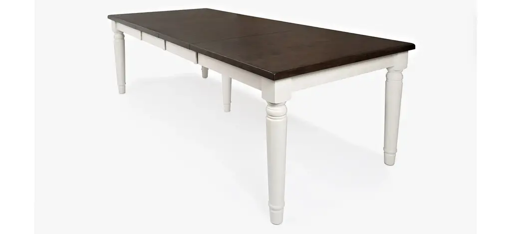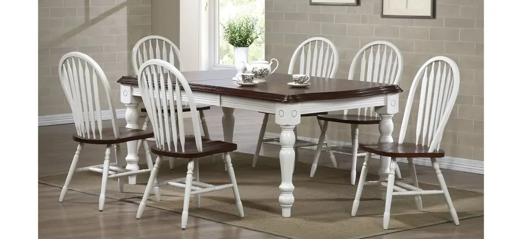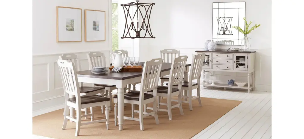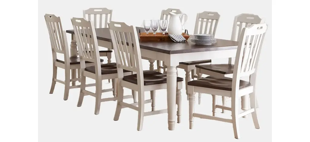 A striking pairing of a rich, farmhouse dark brown top with a soft modern grey base, the Orchard Park Dining Set provides an inviting stage for entertaining. This nine-piece dining set includes one large dining table and eight matching dining chairs. this collection was made for family dinners and weekend get togethers, a stunning combination of country style and beautiful solid hardwood.