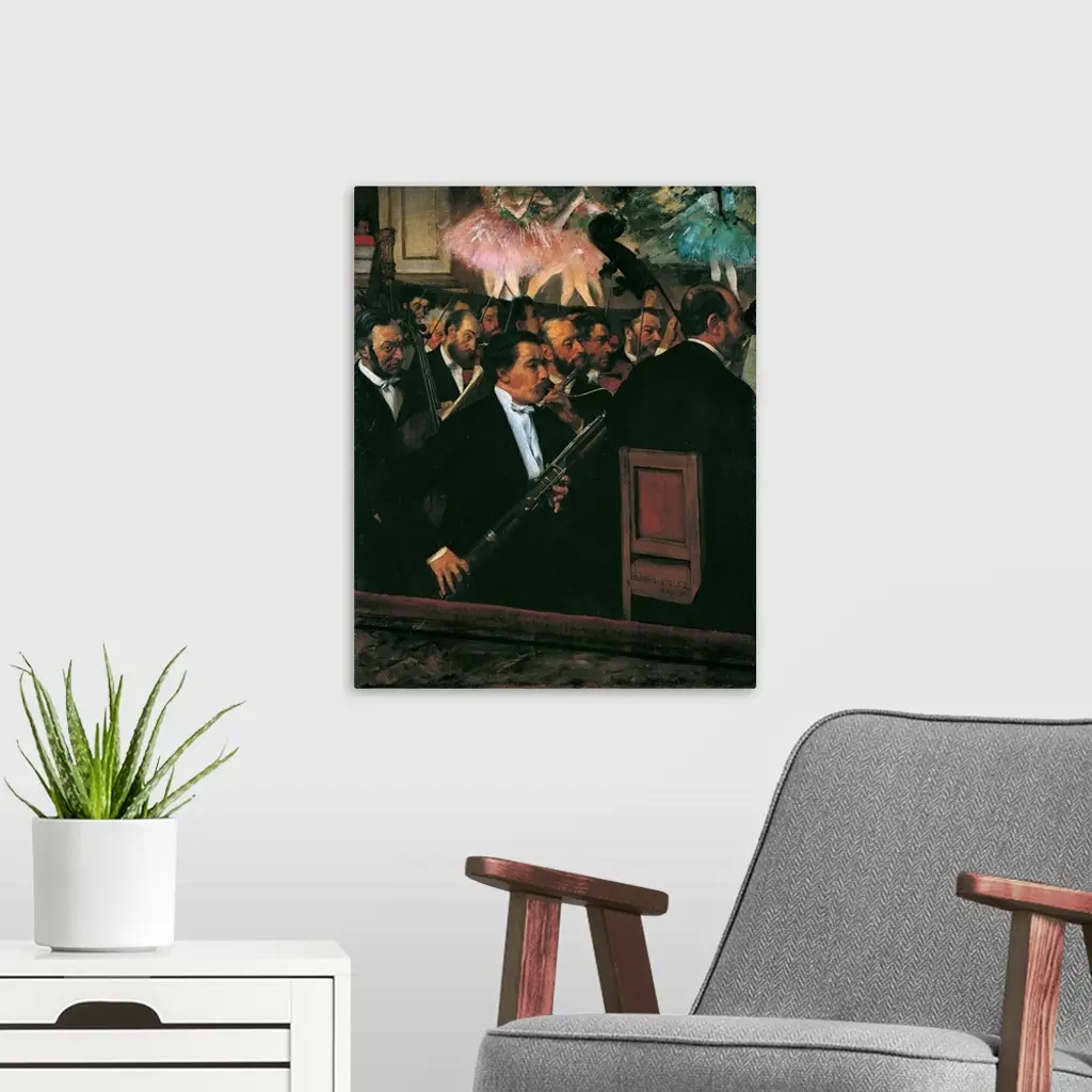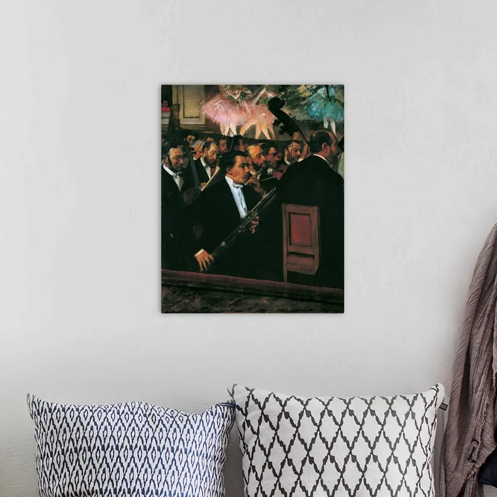 The Orchestra at the Opera House, by Edgar Degas, 1868 - 1869, 19th Century, oil on canvas, cm 56,5 x 46 - France, Ile de France, Paris, Muse dOrsay, RF 2210. All. Orchestra Opera House bassoon flute violin viola cello double bass dancers stage pink azure